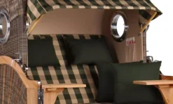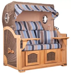 Die ersten Strandkörbe im 19. Jahrhundert wurden traditionell aus Natur-Rattan geflochten. Doch das eher brüchige und nicht besonders langlebige Material wurde längst durch sogenanntes PE(Polyethylen)-Rattan ersetzt. PE-Rattan eignet sich hervorragend für den Einsatz im Outdoorbereich, denn es ist nicht nur witterungs- und UV-Beständig, sondern hält auch großen Temperaturschwankungen stand. Außerdem lässt sich kinderleicht pflegen, denn die glatte Oberfläche ist schmutz- und witterungsabweisend. Das Material besteht aus Polyethylen, einem Kunststoff, der sich, neben den beschriebenen Eigenschaften, zudem vielfältig farblich gestalten lässt und so das Design unserer Strandkorb-Serie Amrum perfekt unterstützt. Die liebevolle Beflechtung der Strandkörbe in Handarbeit, die interessante Gestaltung des Seitenteils mit seinem Sonnengeflecht, sowie die außergewöhnliche Einbindung des Bullauges in den Oberkorb machen den Strandkorb Amrum zu einem Hingucker in Ihrem Outdoorbereich!