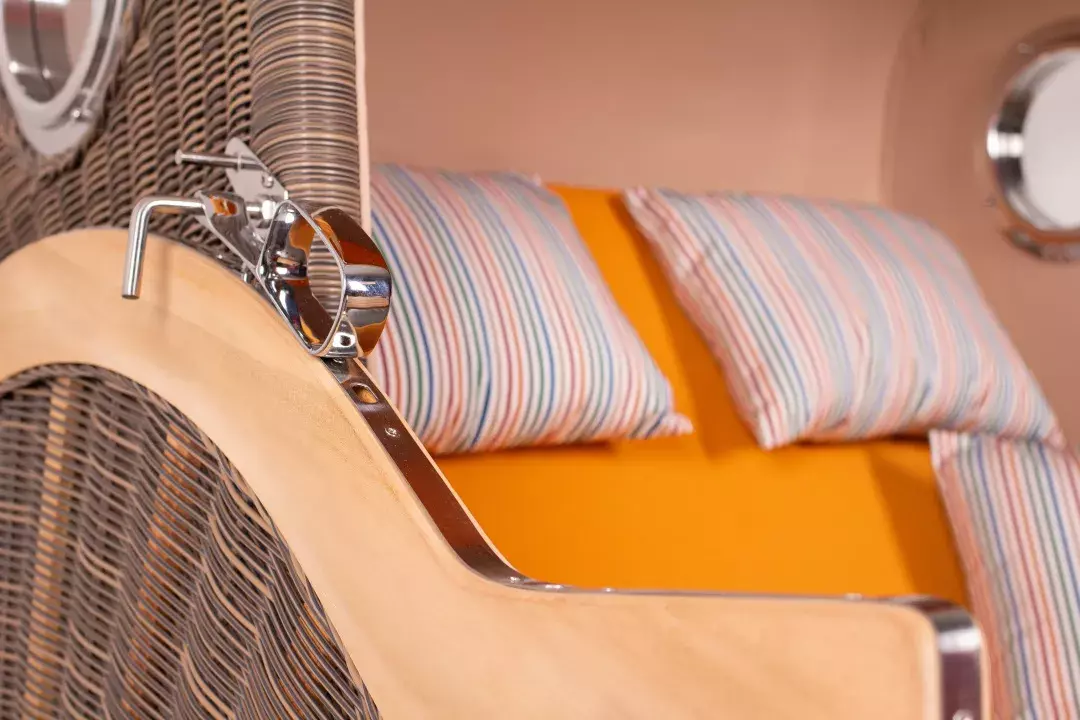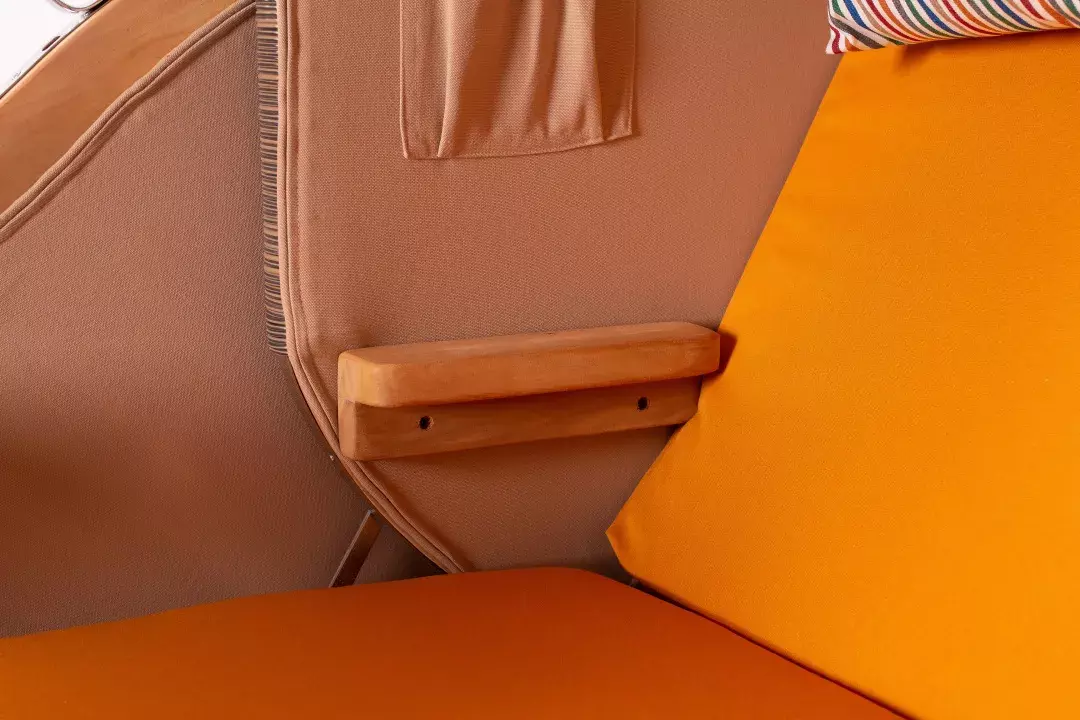 Um das stilvolle Design der Strandkorb-Serie Amrum Grande zu komplettieren, verwenden wir für die Beschläge der Strandkörbe ausschließlich hochwertigen V2A-Edelstahl. Die positiven Eigenschaften des Edelstahls, wie z.B. seine Korrosionsbeständigkeit, unterstreichen den edlen Charakter und heben den maritimen Look des Strandkorbes Amrum hervor. So bestehen nicht nur die Winkelverstärkungen im unteren Bereich des Strandkorbes, sondern auch der Feststellmechanismus aus V2A-Edelstahl. Um den Strandkorb rundum perfekt zu machen, haben wir diesen zudem mit vielen Extras, wie einer bequemen Polsterung, farblich passenden Wurf- und Nackenkissen, Zeitungstaschen, integrierten Armlehnen und schwenkbaren Bistrotischen ausgestattet. Somit lässt der Strandkorb Amrum keine Wünsche offen und bereichert jede Terrasse.