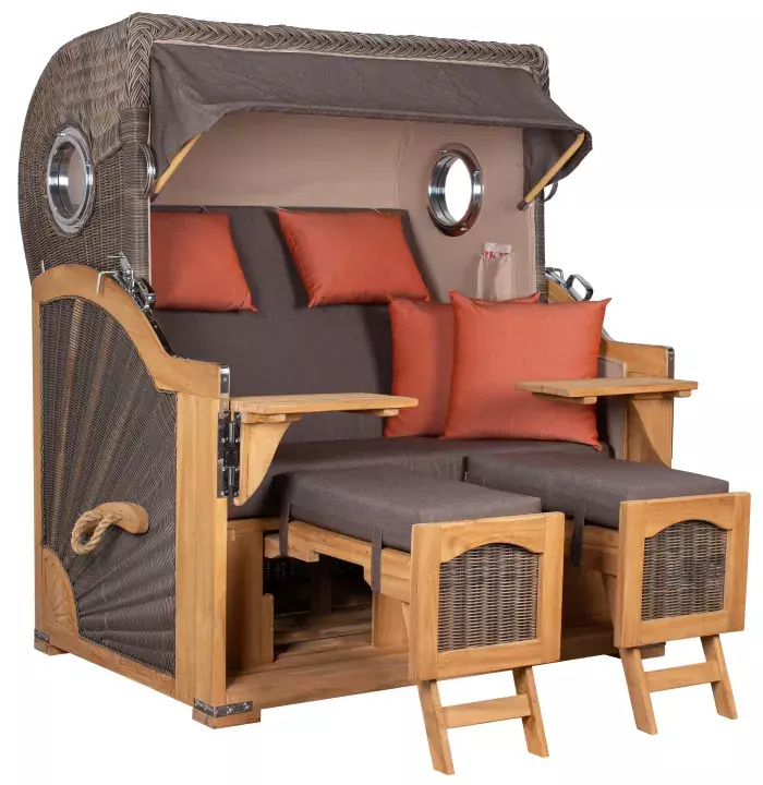 Maritimes Flair mit feiner nostalgischer Note: Mit dem Strandkorb Amrum Grande machen Sie ein Stück der unvergessenen Urlaubserinnerung an Sonne und Wind, an Strand und Wellengang in Ihrem ganz privaten Outdoor-Bereich wieder erlebbar. Der Volllieger aus warmen Teakholz und sorgfältig gearbeiteten PE-Rattan-Geflecht garantiert durch seine dicken Wechselpolster eine Aufenthaltsqualität, die nicht nur komfortabel, sondern geradezu traumhaft entspannend ist. Der Strandkorb Amrum Grande darf ohne Übertreibung als eine Luxusausführung in der Gruppe der Ostsee-Strandkörbe bezeichnet werden. Das hochwertige Teakholz aus nachhaltigem Plantagen-Anbau verleiht dem Strandkorb eine warm-wohlige Ausstrahlung, die durch das sorgfältig von Hand gefertigte Sonnengeflecht aus Polyrattan an beiden Seiten stilsicher verstärkt wird. Das Bullauge rechts und links mit glänzender Aluminium-Einfassung und zertifizierten Sicherheitsglas kann als augenzwinkernde Reminiszenz an steife Brisen und hohen Wellengang verstanden werden – es hat aber auch eine ganz praktische Funktion, weil es stets ausreichend Licht zum Lesen hereinlässt. Träumen Sie sich zurück in Ihre schönste Urlaubserinnerung und genießen Sie dabei ein typisches Getränk, das Sie komfortabel auf einem der beiden schwenkbaren Bistrotische abstellen können. Ja nach Ihrem persönlichen Vorliegen können Sie bei den hautsympathischen und trotzdem sehr witterungsbeständigen Polsterauflagen für den Strandkorb Amrum Grande aus mehreren Dessins wählen. Die Bezüge aus Markisenstoff lassen sich bei Bedarf übrigens abziehen und waschen. Zum Strandkorb Amrum Grande werden Ihnen zwei Wurf- und Nackenkissen inkludiert mit geliefert. Als Modell aus der Bauartreihe der Ostsee-Strandkörbe ist dem Volllieger Amrum Grande naturgemäß eine sehr stabile und robuste Konstruktion zu eigen. Gönnen Sie sich den Luxus einer behaglichen, maritimen Insel inmitten der Wirren des Alltags: Hier können Sie entspannt die Füße hochlegen, windgeschützt in die Sonne blinzeln – und sich von einem bezaubernden Tagtraum treiben lassen. Und fast fühlt es sich dann wie Urlaub an.