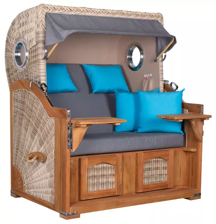 Maritimes Flair mit feiner nostalgischer Note: Mit dem Strandkorb Amrum Grande machen Sie ein Stück der unvergessenen Urlaubserinnerung an Sonne und Wind, an Strand und Wellengang in Ihrem ganz privaten Outdoor-Bereich wieder erlebbar. Der Volllieger aus warmen Teakholz und sorgfältig gearbeiteten PE-Rattan-Geflecht garantiert durch seine dicken Wechselpolster eine Aufenthaltsqualität, die nicht nur komfortabel, sondern geradezu traumhaft entspannend ist. Der Strandkorb Amrum Grande darf ohne Übertreibung als eine Luxusausführung in der Gruppe der Ostsee-Strandkörbe bezeichnet werden. Das hochwertige Teakholz aus nachhaltigem Plantagen-Anbau verleiht dem Strandkorb eine warm-wohlige Ausstrahlung, die durch das sorgfältig von Hand gefertigte Sonnengeflecht aus Polyrattan an beiden Seiten stilsicher verstärkt wird. Das Bullauge rechts und links mit glänzender Aluminium-Einfassung und zertifizierten Sicherheitsglas kann als augenzwinkernde Reminiszenz an steife Brisen und hohen Wellengang verstanden werden – es hat aber auch eine ganz praktische Funktion, weil es stets ausreichend Licht zum Lesen hereinlässt. Träumen Sie sich zurück in Ihre schönste Urlaubserinnerung und genießen Sie dabei ein typisches Getränk, das Sie komfortabel auf einem der beiden schwenkbaren Bistrotische abstellen können. Ja nach Ihrem persönlichen Vorliegen können Sie bei den hautsympathischen und trotzdem sehr witterungsbeständigen Polsterauflagen für den Strandkorb Amrum Grande aus mehreren Dessins wählen. Die Bezüge aus Markisenstoff lassen sich bei Bedarf übrigens abziehen und waschen. Zum Strandkorb Amrum Grande werden Ihnen zwei Wurf- und Nackenkissen inkludiert mit geliefert. Als Modell aus der Bauartreihe der Ostsee-Strandkörbe ist dem Volllieger Amrum Grande naturgemäß eine sehr stabile und robuste Konstruktion zu eigen. Gönnen Sie sich den Luxus einer behaglichen, maritimen Insel inmitten der Wirren des Alltags: Hier können Sie entspannt die Füße hochlegen, windgeschützt in die Sonne blinzeln – und sich von einem bezaubernden Tagtraum treiben lassen. Und fast fühlt es sich dann wie Urlaub an.
