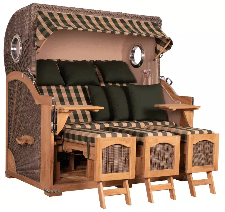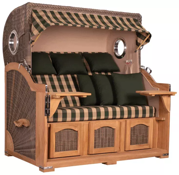 Sie wünschen sich ein extravagantes und langlebiges Outdoor-Sofa, auf dem Sie mit Ihrer Familie gesellige Entspannungsmomente genießen können? Der Strandkorb Amrum Grande XXL bietet 3 Personen ausreichend Platz, um gemeinsam erholsame Sommertage unter freiem Himmel zu verbringen. Wie alle Strandkörbe der eleganten Amrum Grande XXL Kollektion besticht auch dieses Modell durch seine erstklassige Ausstattung und seinen zeitlosen Charme. Wertvolles Tropenholz und ein robustes PE-Geflecht in traditioneller Optik machen den Strandkorb Amrum Grande XXL zu einem kostbaren Lieblingsstück, das der ganzen Familie viele Sommersaisonen lang Erholung pur schenkt. Das Bullauge mit seiner Umrahmung aus hochglänzendem Aluminium verleiht dem klassischen Design eine nostalgisch maritime Ausstrahlung. Durch die großzügige Sitzfläche können sich im Strandkorb Amrum Grande XXL 3 Personen gleichzeitig ihrer Lieblingslektüre widmen, ein ausgedehntes Sommerfrühstück einnehmen oder an heißen Tagen erfrischende Getränke in vollen Zügen genießen.