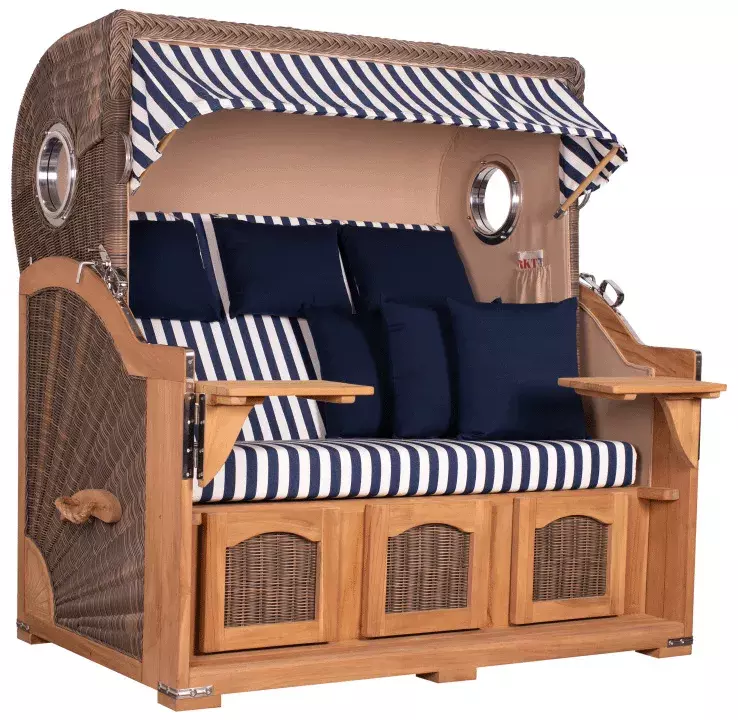 Sie wünschen sich ein extravagantes und langlebiges Outdoor-Sofa, auf dem Sie mit Ihrer Familie gesellige Entspannungsmomente genießen können? Der Strandkorb Amrum Grande XXL bietet 3 Personen ausreichend Platz, um gemeinsam erholsame Sommertage unter freiem Himmel zu verbringen. Wie alle Strandkörbe der eleganten Amrum Grande XXL Kollektion besticht auch dieses Modell durch seine erstklassige Ausstattung und seinen zeitlosen Charme. Wertvolles Tropenholz und ein robustes PE-Geflecht in traditioneller Optik machen den Strandkorb Amrum Grande XXL zu einem kostbaren Lieblingsstück, das der ganzen Familie viele Sommersaisonen lang Erholung pur schenkt. Das Bullauge mit seiner Umrahmung aus hochglänzendem Aluminium verleiht dem klassischen Design eine nostalgisch maritime Ausstrahlung. Durch die großzügige Sitzfläche können sich im Strandkorb Amrum Grande XXL 3 Personen gleichzeitig ihrer Lieblingslektüre widmen, ein ausgedehntes Sommerfrühstück einnehmen oder an heißen Tagen erfrischende Getränke in vollen Zügen genießen.