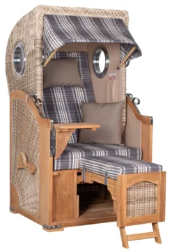 Strandkörbe vermitteln herrliche Urlaubsgefühle, erinnern an Meeresbrisen und Wellenschlagen. Doch auch wenn Sie nicht verreisen, können Sie es sich in Ihrem Strandkorb Amrum Single zu Hause richtig gemütlich machen. Schließlich ist er für Gärten, Terrassen oder größere Balkone ebenso prädestiniert wie für Dünenlandschaften. Als Volllieger mit ausziehbarer Fußstütze lädt er eine Person zu besinnlichen Stunden oder einen wohl verdienten Entspannungsschlaf ein. Unsere exklusiven Strandkorbmodelle bestehen aus edlem Teakholz das ausschließlich aus zertifizierten Holzplantagen und nicht aus Regenwäldern stammt. Ihr ausgezeichnetes Design wird von einem Rattan ähnlichen Polyethylen-Geflecht umgeben. Dieser Material-Mix verleiht dem wertvollen Produkt ein faszinierendes, exotisches Flair. So werden Sie sich über eine lange Lebensdauer dieses Strandkorbes erfreuen können.