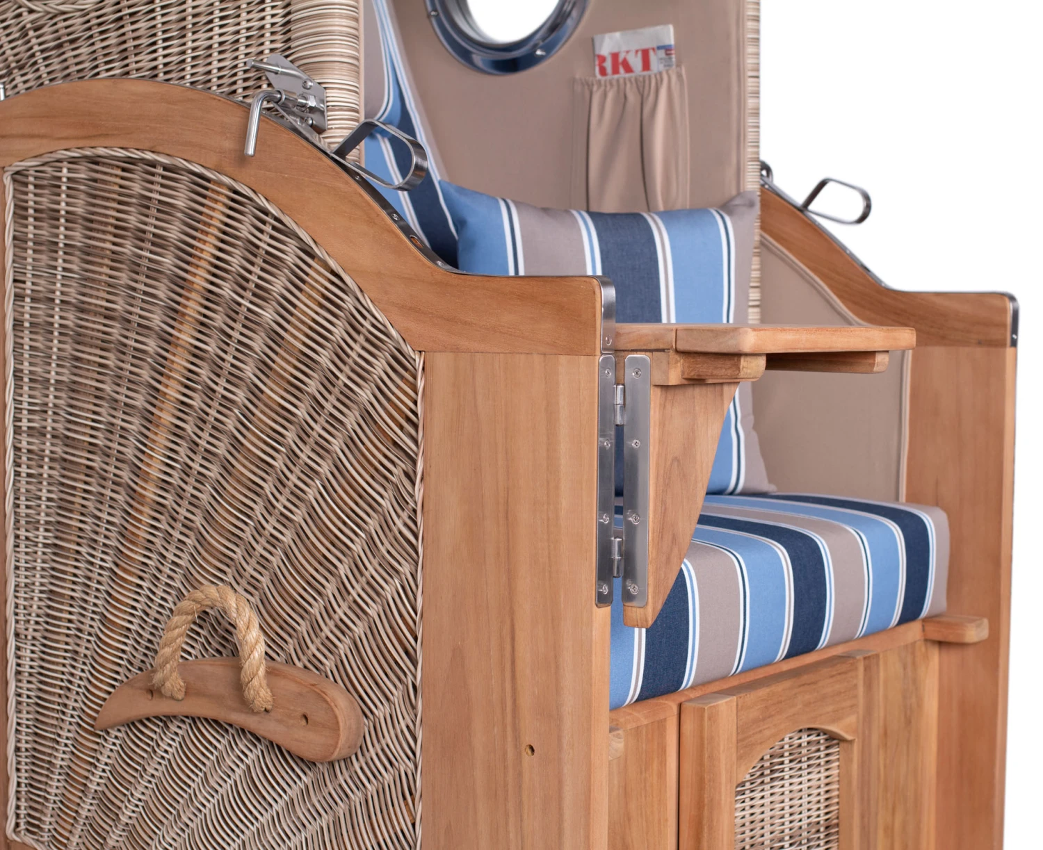 Um das stilvolle Design der Strandkorb-Serie Amrum Single zu komplettieren, verwenden wir für die Beschläge der Strandkörbe ausschließlich hochwertigen V2A-Edelstahl. Die positiven Eigenschaften des Edelstahls, wie z.B. seine Korrosionsbeständigkeit, unterstreichen den edlen Charakter und heben den maritimen Look des Strandkorbes Nordstrand Single hervor. So bestehen nicht nur die Winkelverstärkungen im unteren Bereich des Strandkorbes, sondern auch der Feststellmechanismus aus V2A-Edelstahl. Um den Strandkorb rundum perfekt zu machen, haben wir diesen zudem mit vielen Extras, wie einer bequemen Polsterung, farblich passenden Wurf- und Nackenkissen, Zeitungstaschen, schwenkbaren Bistrotischen und einem praktischen Staufach unterhalb der Sitzfläche ausgestattet. Somit lässt der Strandkorb Spiekeroog Single keine Wünsche offen und bereichert jede Terrasse.