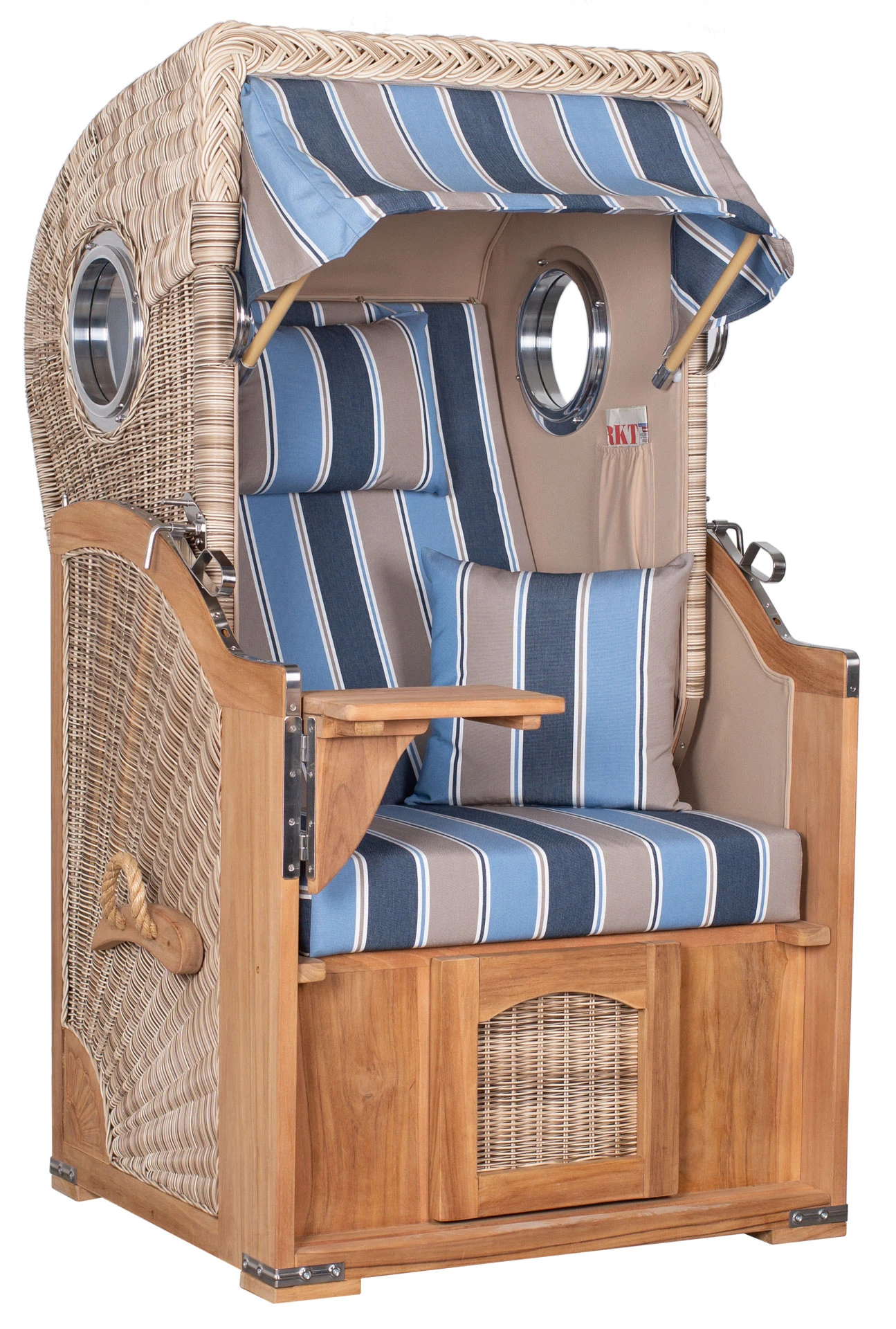 Strandkörbe vermitteln herrliche Urlaubsgefühle, erinnern an Meeresbrisen und Wellenschlagen. Doch auch wenn Sie nicht verreisen, können Sie es sich in Ihrem Strandkorb Amrum Single zu Hause richtig gemütlich machen. Schließlich ist er für Gärten, Terrassen oder größere Balkone ebenso prädestiniert wie für Dünenlandschaften. Als Volllieger mit ausziehbarer Fußstütze lädt er eine Person zu besinnlichen Stunden oder einen wohl verdienten Entspannungsschlaf ein. Unsere exklusiven Strandkorbmodelle bestehen aus edlem Teakholz das ausschließlich aus zertifizierten Holzplantagen und nicht aus Regenwäldern stammt. Ihr ausgezeichnetes Design wird von einem Rattan ähnlichen Polyethylen-Geflecht umgeben. Dieser Material-Mix verleiht dem wertvollen Produkt ein faszinierendes, exotisches Flair. So werden Sie sich über eine lange Lebensdauer dieses Strandkorbes erfreuen können.