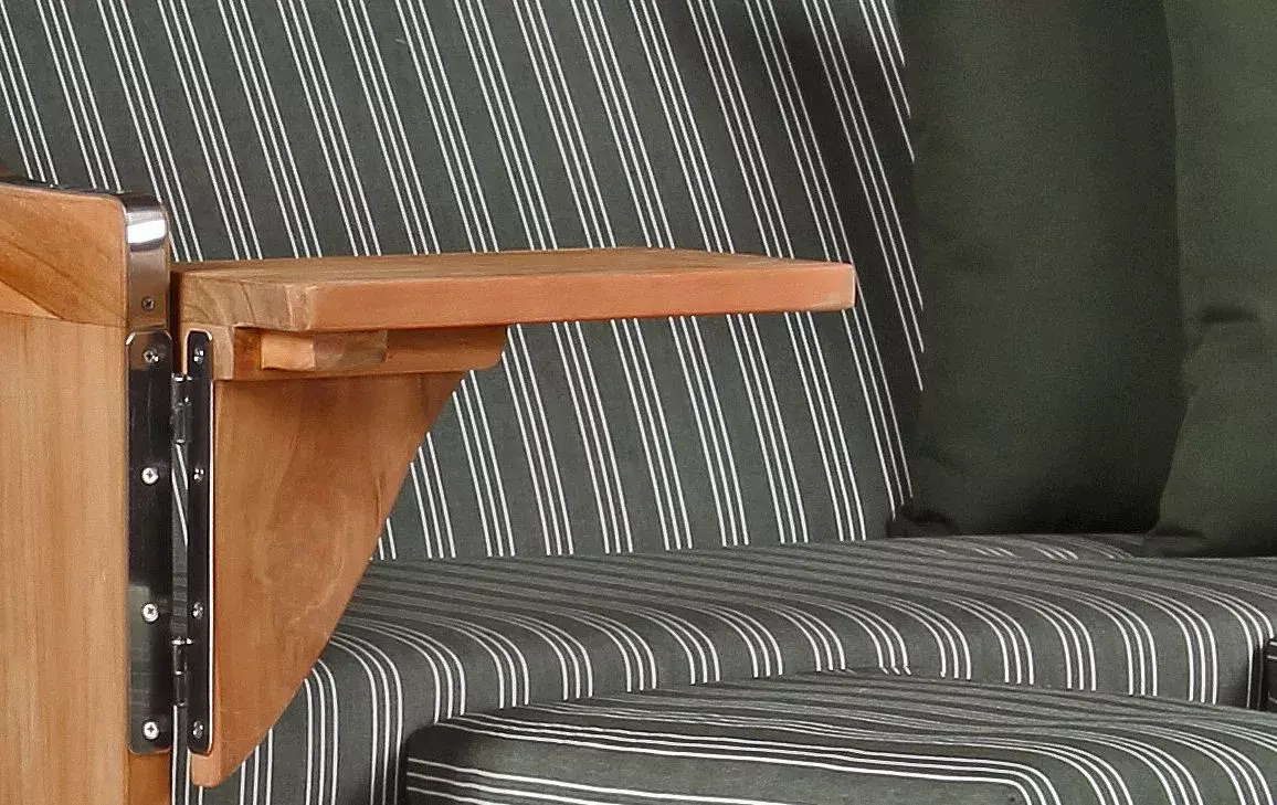 Um das stilvolle Design der Strandkorb-Serie Amrum zu komplettieren, verwenden wir für die Beschläge der Strandkörbe ausschließlich hochwertigen V2A-Edelstahl. Die positiven Eigenschaften des Edelstahls, wie z.B. seine Korrosionsbeständigkeit, unterstreichen den edlen Charakter und heben den maritimen Look des Strandkorbes Amrum hervor. So bestehen nicht nur die Winkelverstärkungen im unteren Bereich des Strandkorbes, sondern auch der Feststellmechanismus aus V2A-Edelstahl. Um den Strandkorb rundum perfekt zu machen, haben wir diesen zudem mit vielen Extras, wie einer bequemen Polsterung, farblich passenden Wurf- und Nackenkissen, Zeitungstaschen, integrierten Armlehnen, schwenkbaren Bistrotischen und einem praktischen Staufach unterhalb der Sitzfläche ausgestattet. Somit lässt der Strandkorb Amrum keine Wünsche offen und bereichert jede Terrasse.