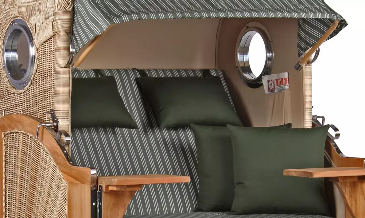 Sie träumen von unvergesslichen Ferientagen in Ihrem privaten Naturparadies? Mit dem Strandkorb Amrum halten zeitlos nostalgischer Stil und höchster Komfort Einzug in Ihren Outdoor-Bereich. Die aufwendige Verarbeitung von optimal witterungsbeständigem Teak und eines in elegant hellem Farbton gehaltenen PE-Geflechts macht die Strandkörbe dieser Luxus-Kollektion zu langlebigen und pflegeleichten Begleitern für entspannte Stunden im Freien. Als komfortabler Volllieger besticht der Strandkorb Amrum nicht nur durch seine hochwertige Materialqualität, sondern wird auch in puncto Ausstattung und Stil höchsten Ansprüchen gerecht. Das maritime Bullauge lässt von Sommerurlauben an endlosen weißen Sandstränden träumen. Gleichzeitig sorgt das Bullauge für optimale Lichtverhältnisse im Innenraum, um gemütlich die Zeitung zu lesen. Die mit hautsympathischer und witterungsbeständiger Kunstfaser bezogenen Wechselpolster verleihen dem Strandkorb Amrum seine individuelle Ausstrahlung. Dank der großen Auswahl an Kissendesigns können Sie die Wechselpolster in genau in der Farbgebung und Musterung bestellen, die Ihren persönlichen Geschmack zum Ausdruck bringen.