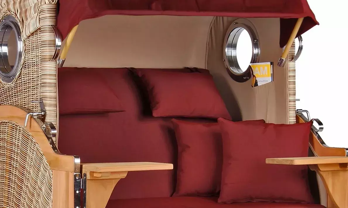 Die ersten Strandkörbe im 19. Jahrhundert wurden traditionell aus Natur-Rattan geflochten. Doch das eher brüchige und nicht besonders langlebige Material wurde längst durch sogenanntes PE(Polyethylen)-Rattan ersetzt. PE-Rattan eignet sich hervorragend für den Einsatz im Outdoorbereich, denn es ist nicht nur witterungs- und UV-Beständig, sondern hält auch großen Temperaturschwankungen stand. Außerdem lässt sich kinderleicht pflegen, denn die glatte Oberfläche ist schmutz- und witterungsabweisend. Das Material besteht aus Polyethylen, einem Kunststoff, der sich, neben den beschriebenen Eigenschaften, zudem vielfältig farblich gestalten lässt und so das Design unserer Strandkorb-Serie Amrum perfekt unterstützt. Die liebevolle Beflechtung der Strandkörbe in Handarbeit, die interessante Gestaltung des Seitenteils mit seinem Sonnengeflecht, sowie die außergewöhnliche Einbindung des Bullauges in den Oberkorb machen den Strandkorb Amrum zu einem Hingucker in Ihrem Outdoorbereich!