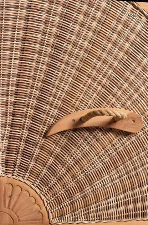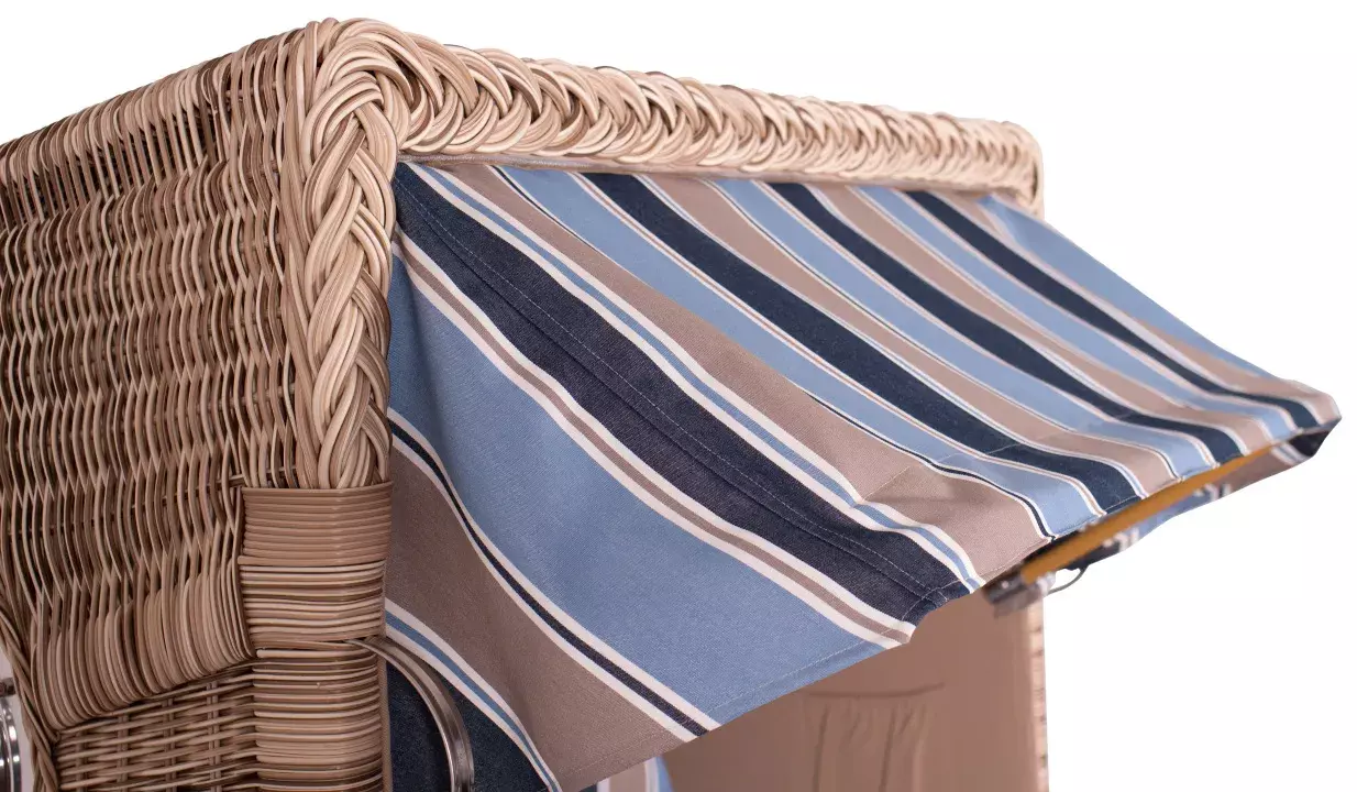 Die ersten Strandkörbe im 19. Jahrhundert wurden traditionell aus Natur-Rattan geflochten. Doch das eher brüchige und nicht besonders langlebige Material wurde längst durch sogenanntes PE(Polyethylen)-Rattan ersetzt. PE-Rattan eignet sich hervorragend für den Einsatz im Outdoorbereich, denn es ist nicht nur witterungs- und UV-Beständig, sondern hält auch großen Temperaturschwankungen stand. Außerdem lässt sich kinderleicht pflegen, denn die glatte Oberfläche ist schmutz- und witterungsabweisend. Das Material besteht aus Polyethylen, einem Kunststoff, der sich, neben den beschriebenen Eigenschaften, zudem vielfältig farblich gestalten lässt und so das Design unserer Strandkorb-Serie Amrum perfekt unterstützt. Die liebevolle Beflechtung der Strandkörbe in Handarbeit, die interessante Gestaltung des Seitenteils mit seinem Sonnengeflecht, sowie die außergewöhnliche Einbindung des Bullauges in den Oberkorb machen den Strandkorb Amrum zu einem Hingucker in Ihrem Outdoorbereich!