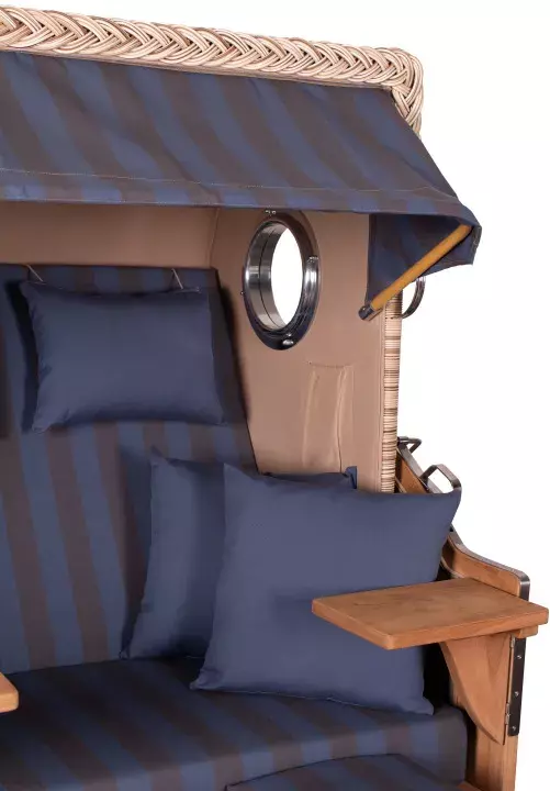 Sie träumen von unvergesslichen Ferientagen in Ihrem privaten Naturparadies? Mit dem Strandkorb Amrum halten zeitlos nostalgischer Stil und höchster Komfort Einzug in Ihren Outdoor-Bereich. Die aufwendige Verarbeitung von optimal witterungsbeständigem Teak und eines in elegant hellem Farbton gehaltenen PE-Geflechts macht die Strandkörbe dieser Luxus-Kollektion zu langlebigen und pflegeleichten Begleitern für entspannte Stunden im Freien. Als komfortabler Volllieger besticht der Strandkorb Amrum nicht nur durch seine hochwertige Materialqualität, sondern wird auch in puncto Ausstattung und Stil höchsten Ansprüchen gerecht. Das maritime Bullauge lässt von Sommerurlauben an endlosen weißen Sandstränden träumen. Gleichzeitig sorgt das Bullauge für optimale Lichtverhältnisse im Innenraum, um gemütlich die Zeitung zu lesen. Die mit hautsympathischer und witterungsbeständiger Kunstfaser bezogenen Wechselpolster verleihen dem Strandkorb Amrum seine individuelle Ausstrahlung. Dank der großen Auswahl an Kissendesigns können Sie die Wechselpolster in genau in der Farbgebung und Musterung bestellen, die Ihren persönlichen Geschmack zum Ausdruck bringen.