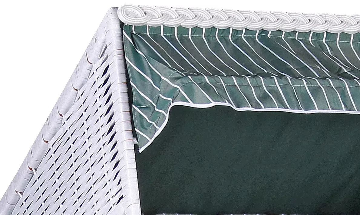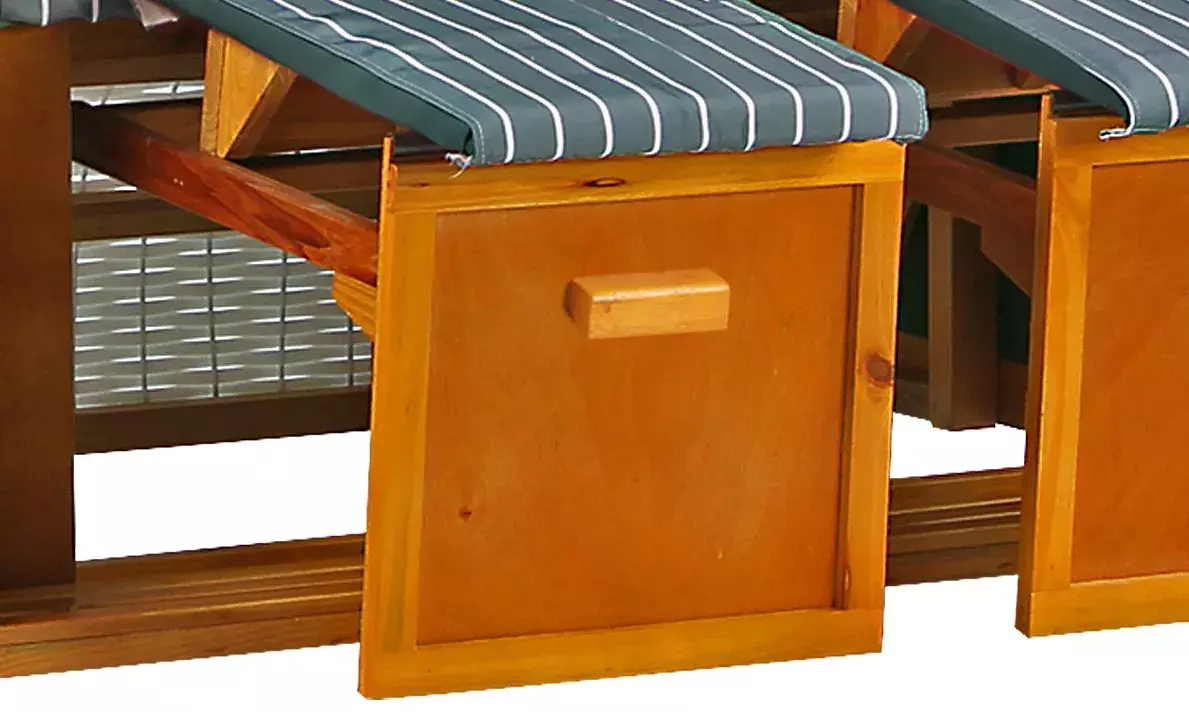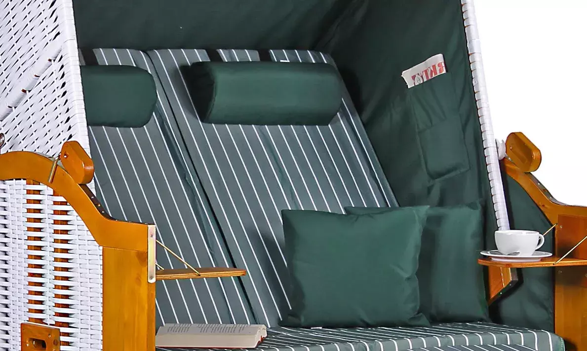 Die Strandkorbserie Baltic überzeugt nicht nur durch die verwendeten Materialen, sondern auch durch die vielen durchdachten Extras, die bereits im Preis inbegriffen sind. Der Strandkorb Baltic verfügt über ausziehbare Fußstützen mit bequemer Polsterauflage im Kissendessin, einen mehrfach verstellbaren Oberkorb und bequeme Rücken- und Sitzkissen. Zudem liefern wir Ihnen den Strandkorb Baltic inklusive passender Wurf- und Nackenkissen. Die Nackenkissen können Sie zudem in der Höhe verstellen, sodass Sie immer die richtige Sitzposition haben, egal ob beim Lesen, Kaffee trinken oder bei einem entspannten Mittagsschläfchen. Die Bezüge der Wurf- und Nackenkissen verfügen über Reißverschlüsse und lassen sich in der Waschmaschine reinigen. Alle Polsterbezüge sind aus strapzierfähigem und schmutzabweisendem Markisenstoff, der sich vor allem bei häufiger Benutzung bewährt hat. Doch auch an das Verstauen von Zeitung und Mobiltelefon wurde gedacht. Die beiden im Kissendesign angefertigten Taschen an den Innenseiten bieten Ihnen Platz für alle was Sie momentan nicht benötigen. Kurzum, der Strandkorb Baltic hat alles zu bieten, was ein klassischer Strandkorb benötigt – Überzeugen Sie sich selbst!