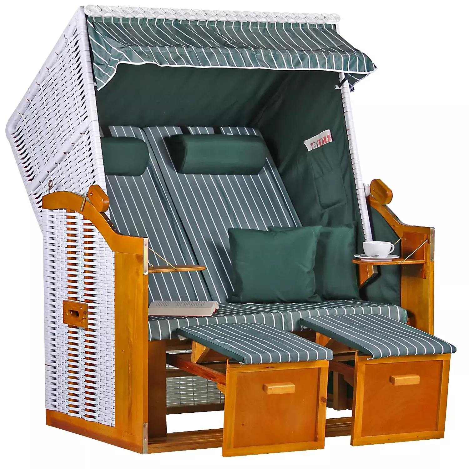 Zeitloses Design und modernste Materialien für optimale Witterungsbeständigkeit – mit dem Strandkorb Baltic hält die Ferienstimmung der malerischen Ostseestrände Einzug in Ihrem Outdoor-Bereich. Als herrlich bequeme Volllieger sind die Strandkörbe unserer Baltic Kollektion langlebige und robuste Ruheinseln, die Ihnen dank der hochwertigen Ausstattung ermöglichen, jede Sommersaison zuhause in vollen Zügen zu genießen. Der Strandkorb Baltic besticht durch seine prägnante Ausstrahlung, die sich aus der warmen Wirkung des hellen Holzes und der fröhlichen Ausstrahlung des weißen PE-Geflechts ergibt. 2 Zeitungstaschen, Klapptische und ausziehbare, weich gepolsterte Fußstützen ermöglichen Ihnen, sich bei mildem und sonnigem Wetter für viele Stunden in Ihr gemütliches Volllieger-Outdoorsofa zurückzuziehen. Lesen Sie in aller Ruhe ein spannendes Buch, nehmen Sie ein sommerliches Frühstück ein oder vergessen Sie bei einem Nickerchen unter freiem Himmel den hektischen Alltag in extravagantem und charmant nostalgischem Rahmen.