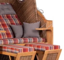 Mit einer Breite von 1,50 m bietet der Strandkorb bequemen Platz. Er hat einen hohen Neigungswinkel und ist mehrfach verstellbar, sodass Sie ihn optimal nach Wind und Wetter ausrichten können. Eine abnehmbare Markise bietet zusätzlich Schutz vor zu viel Sonne. Ablagefläche für kleinere Gegenstände bieten zwei Cocktailtische, die komfortabel schwenkbar sind. Die Nackenkissen sind variabel positionierbar. Es gibt zusätzliche Knuffelkissen und Polster für die Fußstützen. Sämtliche Polster und Bezüge sind abnehmbar und können problemlos gewaschen werden. Sie verleihen diesem Strandkorb im Garten eine besonders originelle Note.