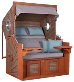 Ein eigener Strandkorb im Garten soll möglichst wetterfest sein. Dieser ansprechende Strandkorb wurde aus Teak-Holz gefertigt. Das Korbgeflecht ist aus Polyethylen gefertigt, einem besonders wetterfesten und temperaturbeständigen Material. Dies macht den Strandkorb zu einem besonders langlebigen Gartenmöbel.