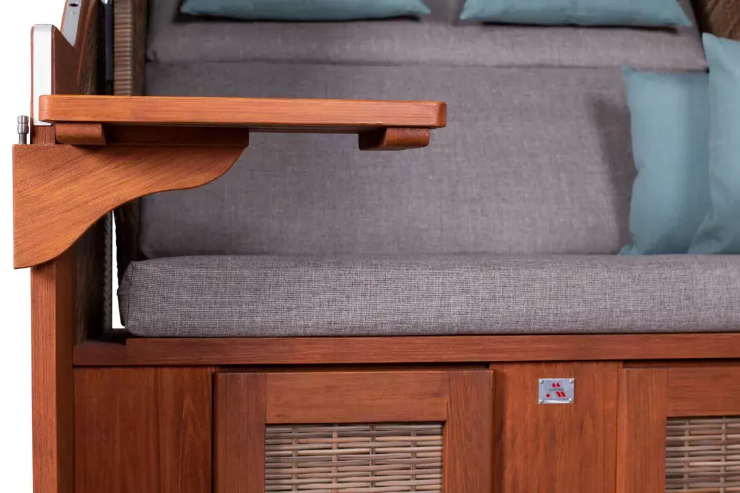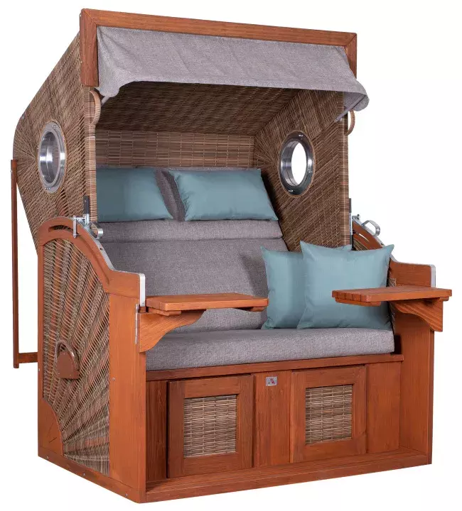 Unser Seaside XL ist aus Pinienholz gefertigt und ist hellbraun gebürstet. Dieses Finish gibt dem Holz die außergewöhnliche Farbe und harmoniert mit dem Geflecht. Die Kissenausstattung in grauen Desin ist perfekt auf den Korb abgestimmt und gibt ihm sein extravagantes Aussehen. Die bequemen und dick gepolsterten Nacken- und Knuffelkissen sind geschmackvoll abgestimmt. Weitere Extras sind das aufwendig geflochtene Sonnengeflecht an den Seitenteilen, die Aluminium-Bullaugen im Oberkorb sowie zwei Cocktailtische. Die ausziehbaren Fußstützen machen Ihr entspanntes Feeling perfekt. Diese sind dick gepolstert, extra lang und auch in der Höhe verstellbar. Durch die Holzleiste am Oberkorb, bekommt unser Seaside XL ein klares Aussehen. Die Sitzbreite und ein etwas höherer Oberkorb, sorgen für bequemes Sitzen.