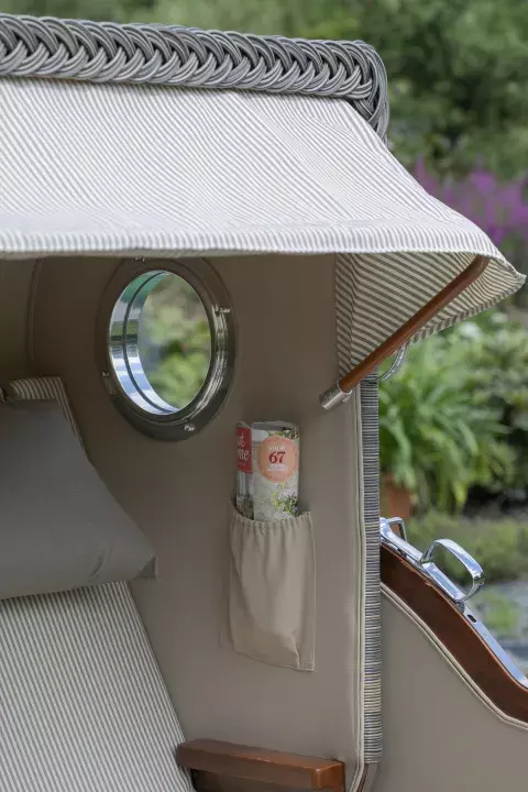 Um das stilvolle Design der Strandkorb-Serie Norderney zu komplettieren, verwenden wir für die Beschläge der Strandkörbe ausschließlich hochwertigen V2A-Edelstahl. Die positiven Eigenschaften des Edelstahls, wie z.B. seine Korrosionsbeständigkeit, unterstreichen den edlen Charakter und heben den maritimen Look des Strandkorbes Norderney hervor. So bestehen nicht nur die Winkelverstärkungen im unteren Bereich des Strandkorbes, sondern auch der Feststellmechanismus aus V2A-Edelstahl. Um den Strandkorb rundum perfekt zu machen, haben wir diesen zudem mit vielen Extras, wie einer bequemen Polsterung, farblich passenden Wurf- und Nackenkissen, Zeitungstaschen, integrierten Armlehnen, schwenkbaren Bistrotischen und einem praktischen Staufach unterhalb der Sitzfläche ausgestattet. Somit lässt der Strandkorb Norderney keine Wünsche offen und bereichert jede Terrasse.