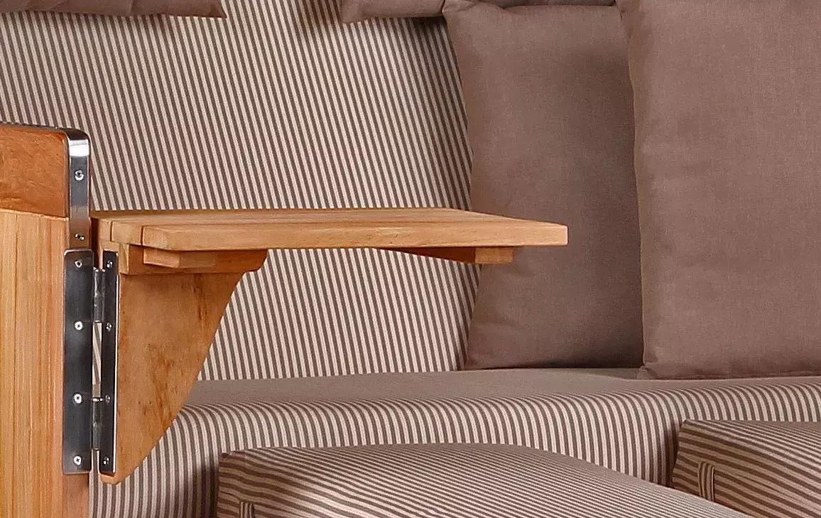 Um das stilvolle Design der Strandkorb-Serie Norderney zu komplettieren, verwenden wir für die Beschläge der Strandkörbe ausschließlich hochwertigen V2A-Edelstahl. Die positiven Eigenschaften des Edelstahls, wie z.B. seine Korrosionsbeständigkeit, unterstreichen den edlen Charakter und heben den maritimen Look des Strandkorbes Norderney hervor. So bestehen nicht nur die Winkelverstärkungen im unteren Bereich des Strandkorbes, sondern auch der Feststellmechanismus aus V2A-Edelstahl. Um den Strandkorb rundum perfekt zu machen, haben wir diesen zudem mit vielen Extras, wie einer bequemen Polsterung, farblich passenden Wurf- und Nackenkissen, Zeitungstaschen, integrierten Armlehnen, schwenkbaren Bistrotischen und einem praktischen Staufach unterhalb der Sitzfläche ausgestattet. Somit lässt der Strandkorb Norderney keine Wünsche offen und bereichert jede Terrasse.
