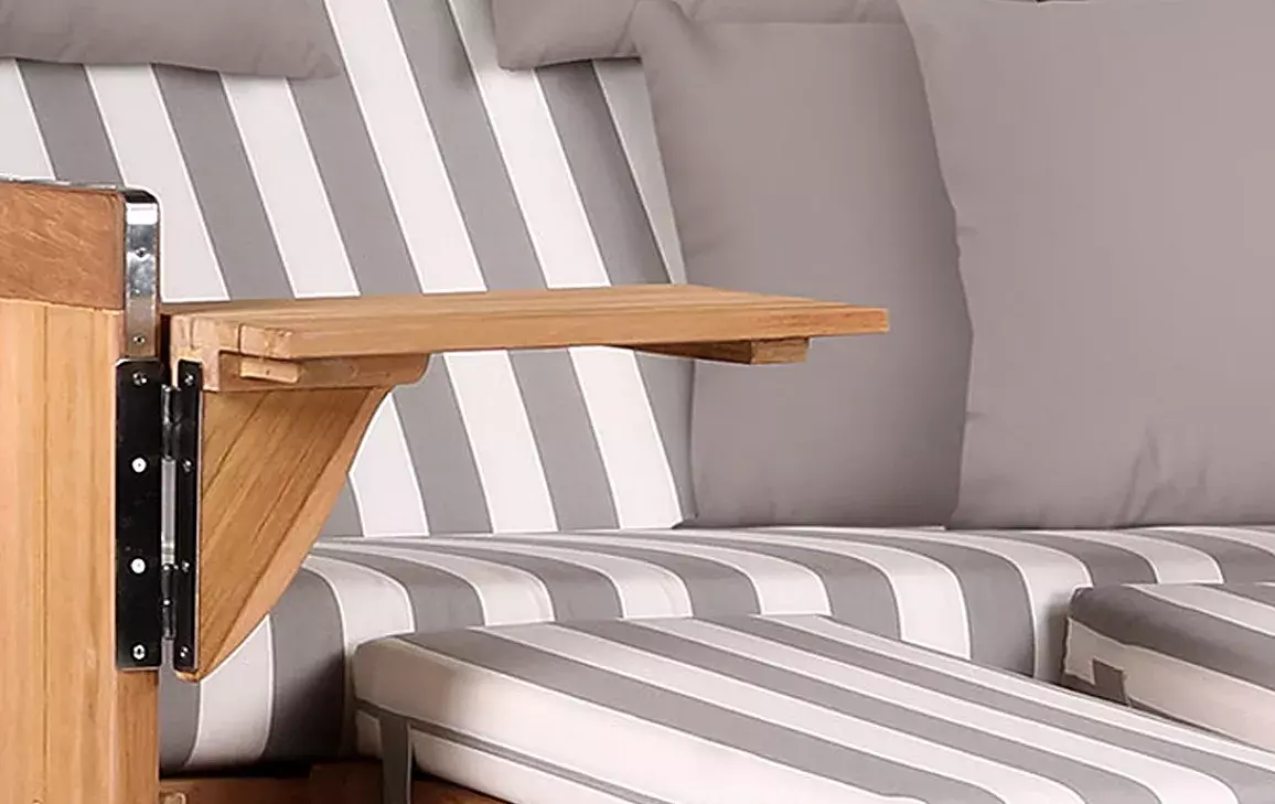 Um das stilvolle Design der Strandkorb-Serie Norderney zu komplettieren, verwenden wir für die Beschläge der Strandkörbe ausschließlich hochwertigen V2A-Edelstahl. Die positiven Eigenschaften des Edelstahls, wie z.B. seine Korrosionsbeständigkeit, unterstreichen den edlen Charakter und heben den maritimen Look des Strandkorbes Norderney hervor. So bestehen nicht nur die Winkelverstärkungen im unteren Bereich des Strandkorbes, sondern auch der Feststellmechanismus aus V2A-Edelstahl. Um den Strandkorb rundum perfekt zu machen, haben wir diesen zudem mit vielen Extras, wie einer bequemen Polsterung, farblich passenden Wurf- und Nackenkissen, Zeitungstaschen, integrierten Armlehnen, schwenkbaren Bistrotischen und einem praktischen Staufach unterhalb der Sitzfläche ausgestattet. Somit lässt der Strandkorb Norderney keine Wünsche offen und bereichert jede Terrasse.