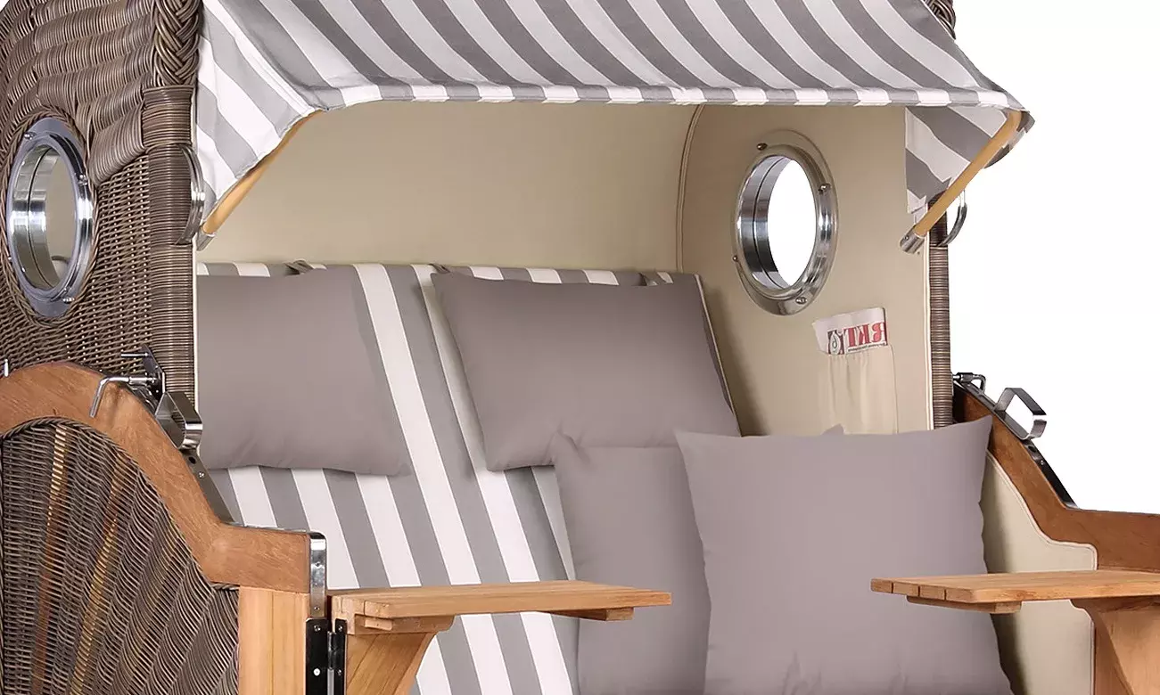 Sie träumen von unvergesslichen Ferientagen in Ihrem privaten Naturparadies? Mit dem Strandkorb Norderney halten zeitlos nostalgischer Stil und höchster Komfort Einzug in Ihren Outdoor-Bereich. Die aufwendige Verarbeitung von optimal witterungsbeständigem Teak und eines in elegant hellem Farbton gehaltenen PE-Geflechts macht die Strandkörbe dieser Luxus-Kollektion zu langlebigen und pflegeleichten Begleitern für entspannte Stunden im Freien. Als komfortabler Volllieger besticht der Strandkorb Norderney nicht nur durch seine hochwertige Materialqualität, sondern wird auch in puncto Ausstattung und Stil höchsten Ansprüchen gerecht. Das maritime Bullauge lässt von Sommerurlauben an endlosen weißen Sandstränden träumen. Gleichzeitig sorgt das Bullauge für optimale Lichtverhältnisse im Innenraum, um gemütlich die Zeitung zu lesen. Die mit hautsympathischer und witterungsbeständiger Kunstfaser bezogenen Wechselpolster verleihen dem Strandkorb Norderney seine individuelle Ausstrahlung. Dank der großen Auswahl an Kissendesigns können Sie die Wechselpolster in genau in der Farbgebung und Musterung bestellen, die Ihren persönlichen Geschmack zum Ausdruck bringen.