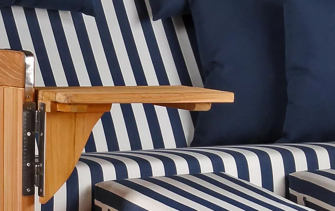Um das stilvolle Design der Strandkorb-Serie Norderney zu komplettieren, verwenden wir für die Beschläge der Strandkörbe ausschließlich hochwertigen V2A-Edelstahl. Die positiven Eigenschaften des Edelstahls, wie z.B. seine Korrosionsbeständigkeit, unterstreichen den edlen Charakter und heben den maritimen Look des Strandkorbes Norderney hervor. So bestehen nicht nur die Winkelverstärkungen im unteren Bereich des Strandkorbes, sondern auch der Feststellmechanismus aus V2A-Edelstahl. Um den Strandkorb rundum perfekt zu machen, haben wir diesen zudem mit vielen Extras, wie einer bequemen Polsterung, farblich passenden Wurf- und Nackenkissen, Zeitungstaschen, integrierten Armlehnen, schwenkbaren Bistrotischen und einem praktischen Staufach unterhalb der Sitzfläche ausgestattet. Somit lässt der Strandkorb Norderney keine Wünsche offen und bereichert jede Terrasse.