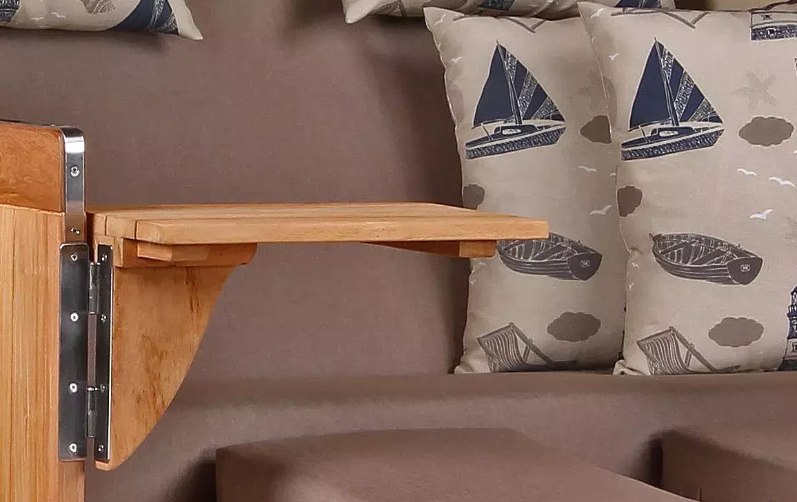Um das stilvolle Design der Strandkorb-Serie Norderney zu komplettieren, verwenden wir für die Beschläge der Strandkörbe ausschließlich hochwertigen V2A-Edelstahl. Die positiven Eigenschaften des Edelstahls, wie z.B. seine Korrosionsbeständigkeit, unterstreichen den edlen Charakter und heben den maritimen Look des Strandkorbes Norderney hervor. So bestehen nicht nur die Winkelverstärkungen im unteren Bereich des Strandkorbes, sondern auch der Feststellmechanismus aus V2A-Edelstahl. Um den Strandkorb rundum perfekt zu machen, haben wir diesen zudem mit vielen Extras, wie einer bequemen Polsterung, farblich passenden Wurf- und Nackenkissen, Zeitungstaschen, integrierten Armlehnen, schwenkbaren Bistrotischen und einem praktischen Staufach unterhalb der Sitzfläche ausgestattet. Somit lässt der Strandkorb Norderney keine Wünsche offen und bereichert jede Terrasse.
