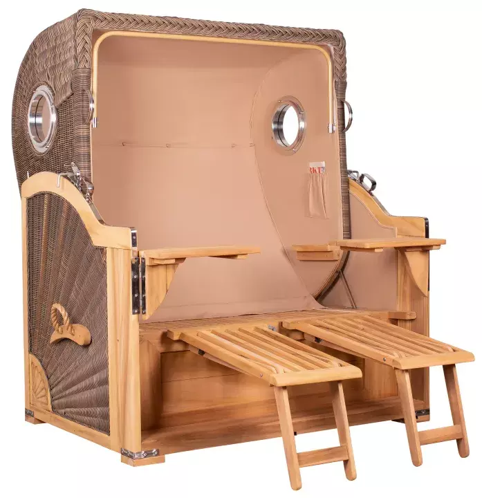 Elegant, edel, einzigartiger Charakter und echtes Urlaubsfeeling mit dem idyllischen Flair der Nord- und Ostseeküste – mit dem Strandkorb Norderney schaffen Sie sich ihre eigene kleine Wohlfühloase mitten im eigenen Garten oder auf der heimischen Terrasse. Selbst im Wintergarten oder einfach mal vor dem Kamin lädt der Strandkorb Norderney mit seiner Gemütlichkeit und Wohlfühlcharme auch bei schlechtem Wetter zum Entspannen und Verweilen ein. Dabei beweist dieses Volllieger Modell, dass in der Tat Strandkorb nicht gleich Strandkorb ist. Qualitativ hochwertige Strandkörbe dieser Art beeindrucken vor allem durch ihre Symbiose von Eigenschaften und einem unverwechselbaren Charakter. So bilden Design, Komfort und Funktionalität beim Strandkorb Norderney eine miteinander harmonierende Einheit, die Sie sowohl mit optischer Attraktivität als auch mit funktioneller Vielfalt sowie komfortablen Extras beeindrucken wird. Der für zwei Personen ausgelegte Volllieger bietet Ihnen mit dem integrierten Bullauge und dem edlen Teakholz ein echt maritimes Design, das zu jeder Zeit an einen Strandurlaub auf Norderney oder anderen ostfriesischen Inseln, in Glücksburg, in Hohwacht mit seinem Ostseeheilbad, in Warnemünde oder etwa auf Fehmarn erinnert. Die maritime Stilrichtung wird dabei gerade von der Holzoptik, den farblich abgestimmten Stoffen, Kissen und Bezügen sowie eben durch das optisch auffällige Bullauge geprägt. Der Strandkorb Norderney bringt zweifelsohne Glanz und Gemütlichkeit in Ihren Garten; inklusive echter Wohlfühlatmosphäre.