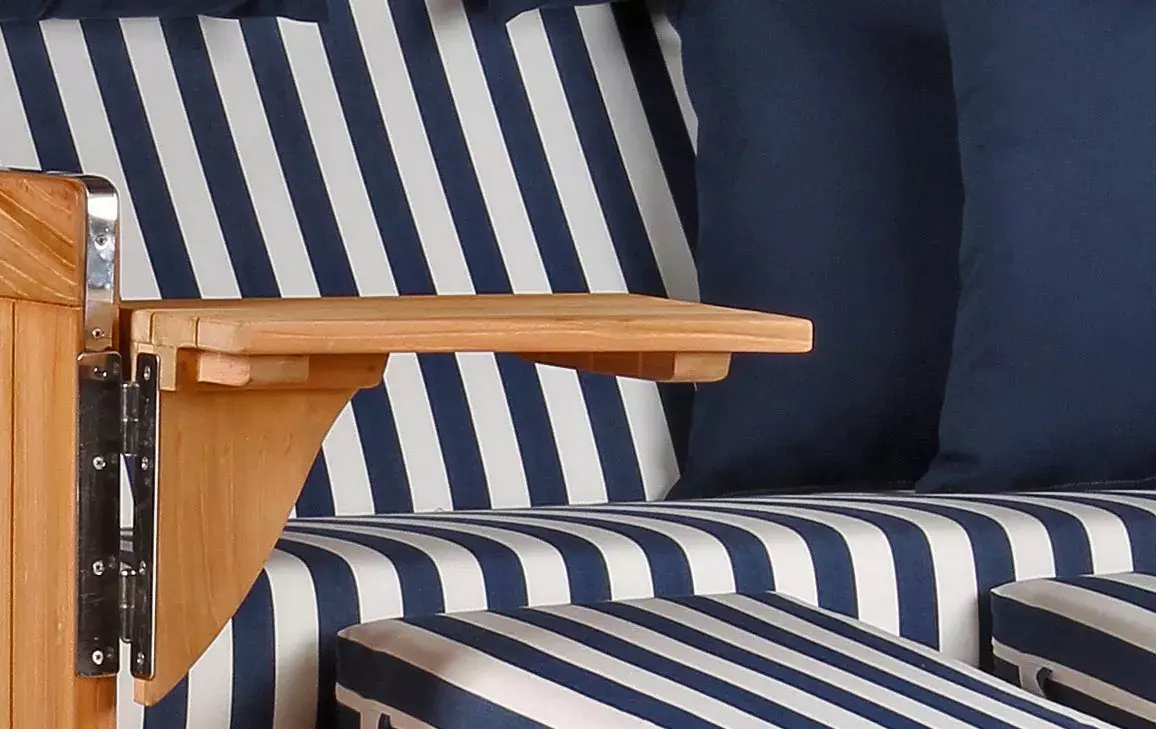 Um das stilvolle Design der Strandkorb-Serie Norderney zu komplettieren, verwenden wir für die Beschläge der Strandkörbe ausschließlich hochwertigen V2A-Edelstahl. Die positiven Eigenschaften des Edelstahls, wie z.B. seine Korrosionsbeständigkeit, unterstreichen den edlen Charakter und heben den maritimen Look des Strandkorbes Norderney hervor. So bestehen nicht nur die Winkelverstärkungen im unteren Bereich des Strandkorbes, sondern auch der Feststellmechanismus und die Einfassung der Bullaugen aus V2A-Edelstahl. Um den Strandkorb rundum perfekt zu machen, haben wir diesen zudem mit vielen Extras, wie einer bequemen Polsterung, farblich passenden Wurf- und Nackenkissen, Zeitungstaschen, integrierten Armlehnen, schwenkbaren Bistrotischen und einem praktischen Staufach unterhalb der Sitzfläche ausgestattet. Somit lässt der Strandkorb Norderney keine Wünsche offen und bereichert jede Terrasse.