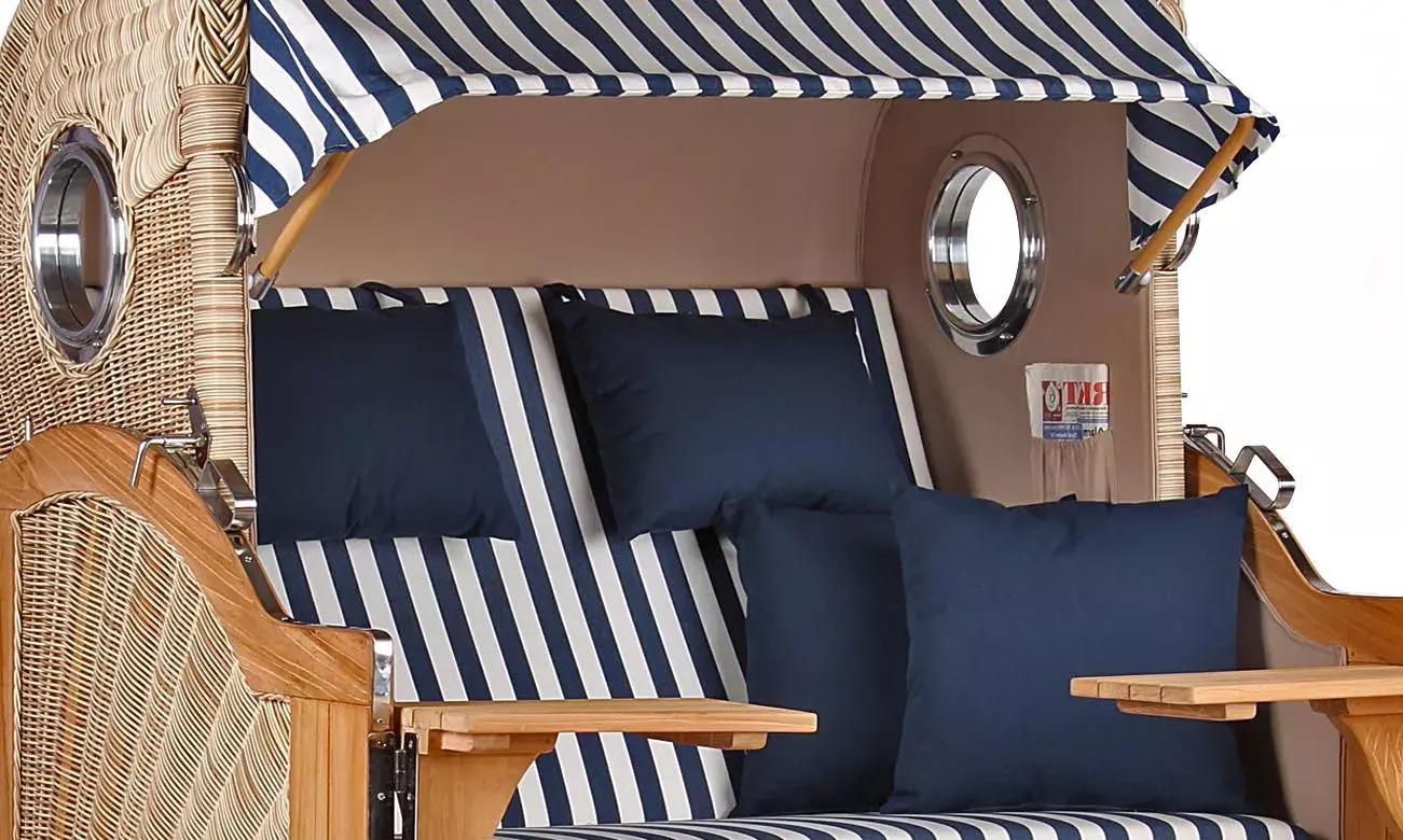 Elegant, edel, einzigartiger Charakter und echtes Urlaubsfeeling mit dem idyllischen Flair der Nord- und Ostseeküste – mit dem Strandkorb Norderney schaffen Sie sich ihre eigene kleine Wohlfühloase mitten im eigenen Garten oder auf der heimischen Terrasse. Selbst im Wintergarten oder einfach mal vor dem Kamin lädt der Strandkorb Norderney mit seiner Gemütlichkeit und Wohlfühlcharme auch bei schlechtem Wetter zum Entspannen und Verweilen ein. Dabei beweist dieses Volllieger Modell, dass in der Tat Strandkorb nicht gleich Strandkorb ist. Qualitativ hochwertige Strandkörbe dieser Art beeindrucken vor allem durch ihre Symbiose von Eigenschaften und einem unverwechselbaren Charakter. So bilden Design, Komfort und Funktionalität beim Strandkorb Norderney eine miteinander harmonierende Einheit, die Sie sowohl mit optischer Attraktivität als auch mit funktioneller Vielfalt sowie komfortablen Extras beeindrucken wird. Der für zwei Personen ausgelegte Volllieger bietet Ihnen mit dem integrierten Bullauge und dem edlen Teakholz ein echt maritimes Design, das zu jeder Zeit an einen Strandurlaub auf Norderney oder anderen ostfriesischen Inseln, in Glücksburg, in Hohwacht mit seinem Ostseeheilbad, in Warnemünde oder etwa auf Fehmarn erinnert. Die maritime Stilrichtung wird dabei gerade von der Holzoptik, den farblich abgestimmten Stoffen, Kissen und Bezügen sowie eben durch das optisch auffällige Bullauge geprägt. Der Strandkorb Norderney bringt zweifelsohne Glanz und Gemütlichkeit in Ihren Garten; inklusive echter Wohlfühlatmosphäre.