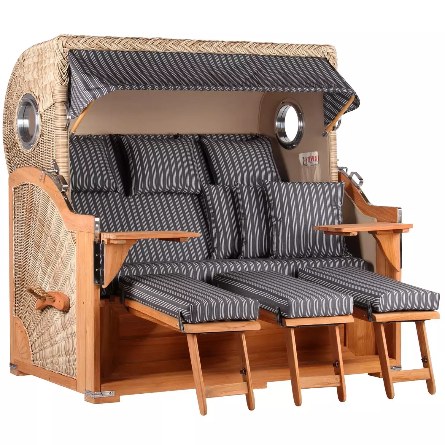 Sie wünschen sich ein extravagantes und langlebiges Outdoor-Sofa, auf dem Sie mit Ihrer Familie gesellige Entspannungsmomente genießen können? Der Strandkorb Norderney XXL bietet 3 Personen ausreichend Platz, um gemeinsam erholsame Sommertage unter freiem Himmel zu verbringen. Wie alle Strandkörbe der eleganten Norderney Kollektion besticht auch dieses Modell durch seine erstklassige Ausstattung und seinen zeitlosen Charme. Wertvolles Tropenholz und ein robustes PE-Geflecht in traditioneller Optik machen den Strandkorb Norderney XXL zu einem kostbaren Lieblingsstück, das der ganzen Familie viele Sommersaisonen lang Erholung pur schenkt. Das Bullauge mit seiner Umrahmung aus hochglänzendem Aluminium verleiht dem klassischen Design eine nostalgisch maritime Ausstrahlung. Durch die großzügige Sitzfläche können sich im Strandkorb Norderney 3 Personen gleichzeitig ihrer Lieblingslektüre widmen, ein ausgedehntes Sommerfrühstück einnehmen oder an heißen Tagen erfrischende Getränke in vollen Zügen genießen.