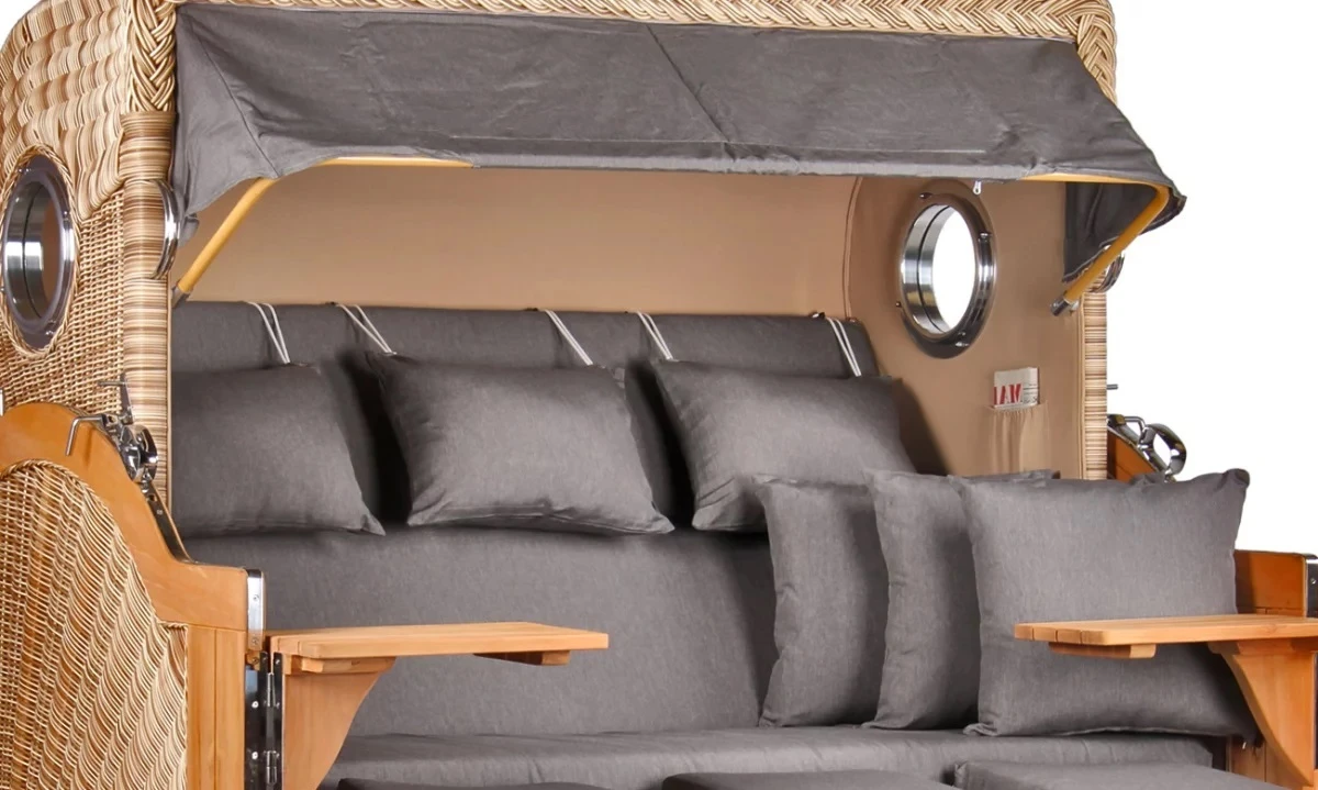 Die ersten Strandkörbe im 19. Jahrhundert wurden traditionell aus Natur-Rattan geflochten. Doch das eher brüchige und nicht besonders langlebige Material wurde längst durch sogenanntes PE(Polyethylen)-Rattan ersetzt. PE-Rattan eignet sich hervorragend für den Einsatz im Outdoorbereich, denn es ist nicht nur witterungs- und UV-Beständig, sondern hält auch großen Temperaturschwankungen stand. Außerdem lässt sich kinderleicht pflegen, denn die glatte Oberfläche ist schmutz- und witterungsabweisend. Das Material besteht aus Polyethylen, einem Kunststoff, der sich, neben den beschriebenen Eigenschaften, zudem vielfältig farblich gestalten lässt und so das Design unserer Strandkorb-Serie Norderney perfekt unterstützt. Die liebevolle Beflechtung der Strandkörbe in Handarbeit, die interessante Gestaltung des Seitenteils mit seinem Sonnengeflecht, sowie die außergewöhnliche Einbindung des Bullauges in den Oberkorb machen den Strandkorb Norderney zu einem Hingucker in Ihrem Outdoorbereich!