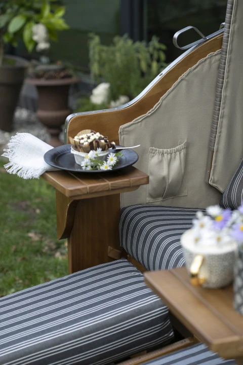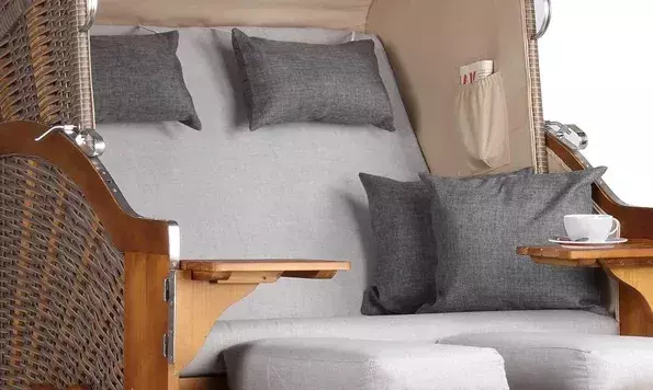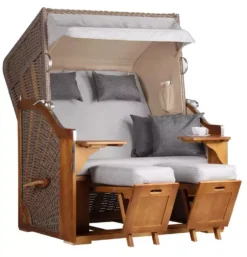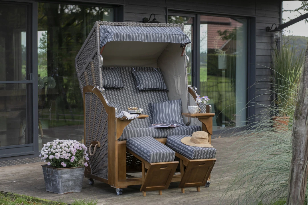 Die Bezüge bestehen aus hochwertigem Polyester und sind dank des Reißverschlusses abnehmbar und waschbar, entsprechend der Pflegehinweise. Darüber hinaus beinhaltet der Strandkorb zwei einschiebbare Fußbänke und zwei schwenkbare Bistrotische, die dir den zusätzlichen Komfort und die praktische Ablagefläche bieten, die du benötigst.