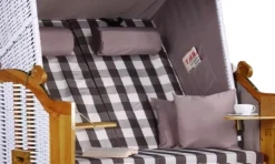 Die innenliegende Schutzfolie des Strandkorbs gewährleistet eine einfache Pflege und eine lange Lebensdauer. Die extra dicken und komfortablen Sitz- und Fußkissen des Strandkorbs laden zum Entspannen ein. Zwei Wurf- und Nackenkissen sind ebenfalls inklusive und bieten zusätzliche Gemütlichkeit.