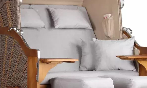 Die innenliegende Schutzfolie des Strandkorbs sorgt für eine langanhaltende Nutzung und erleichtert die Pflege. Die extra dick gepolsterten Sitz- und Fußkissen bieten höchsten Sitzkomfort und laden zum Entspannen ein. Zwei Wurf- und Nackenkissen sind bereits im Lieferumfang enthalten und sorgen für zusätzliche Gemütlichkeit und Luxus.