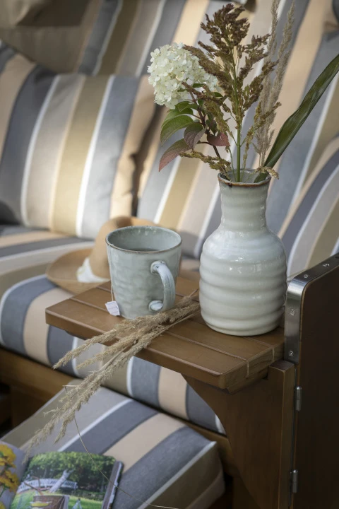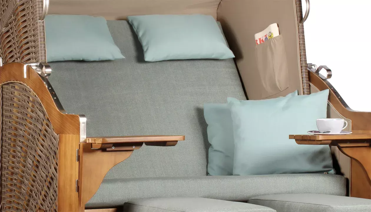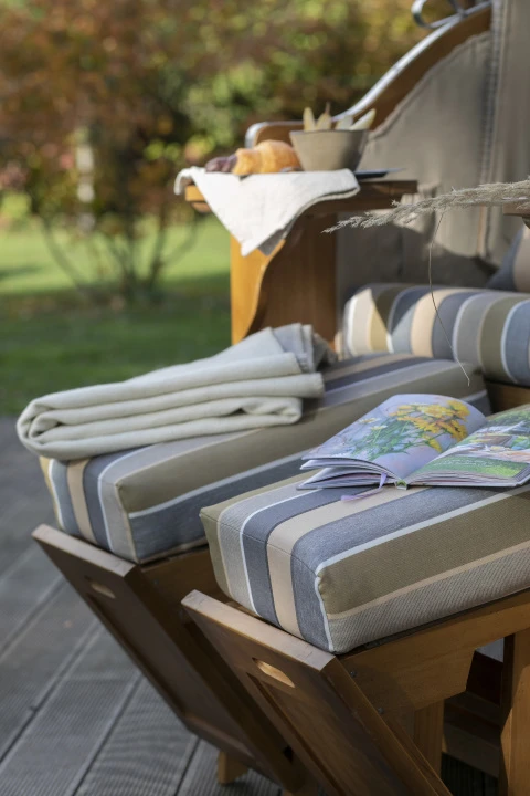 Alle Bezüge des Strandkorbs sind aus hochwertigem Polyester gefertigt und dank des Reißverschlusses abnehmbar und waschbar, entsprechend der Pflegehinweise. Zwei einschiebbare Fußbänke und zwei schwenkbare Bistrotische sorgen für zusätzlichen Komfort und praktische Ablagemöglichkeiten.