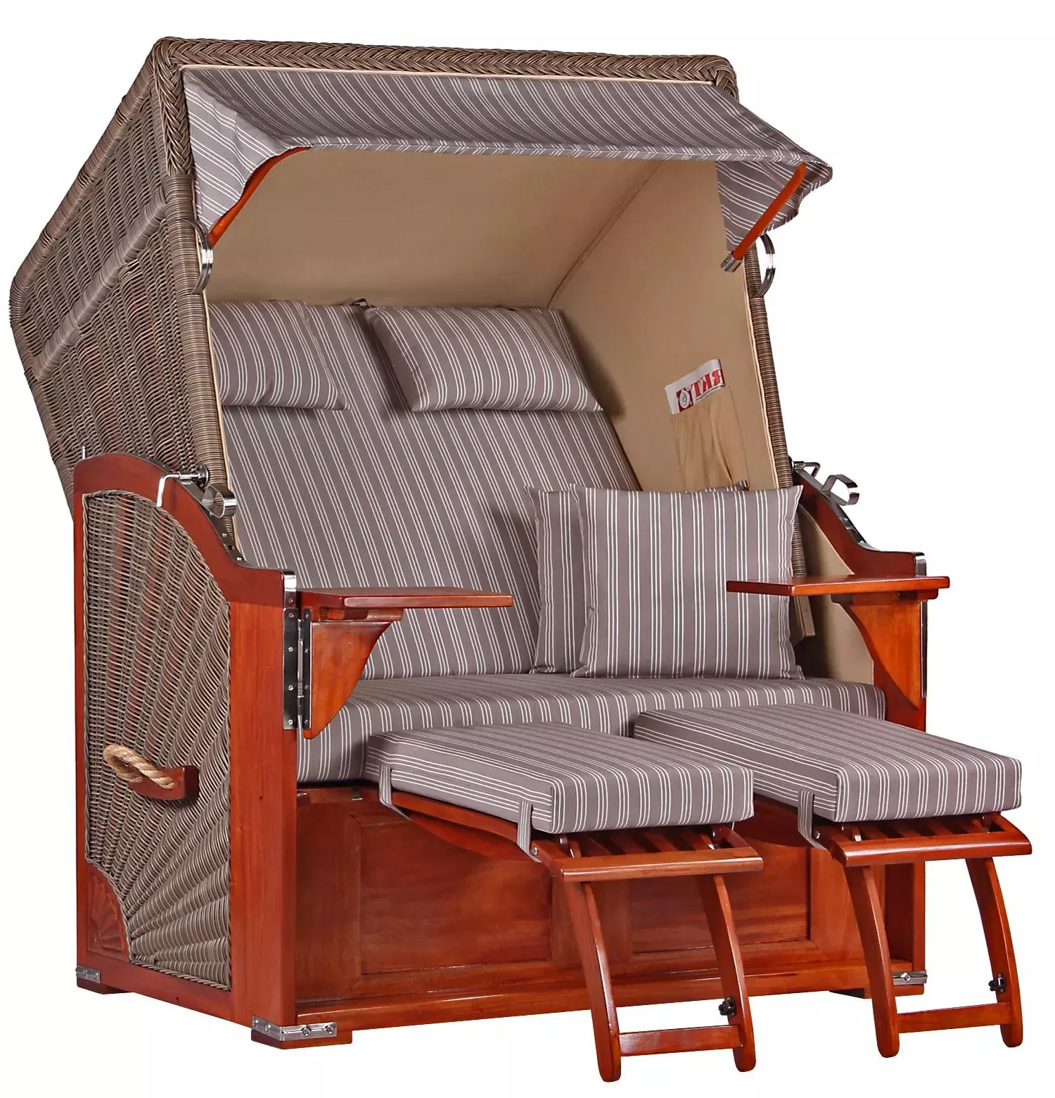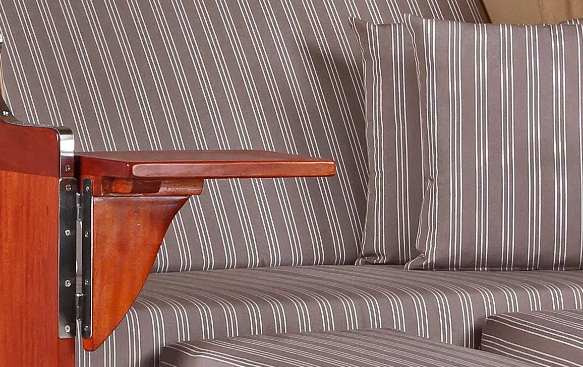 Für unseren Strandkorb Spiekeroog legen wir besonderen Wert auf die liebevolle Verarbeitung hochwertiger Materialien. Aus diesem Grund eignet sich edles Mahagoniholz mit seiner charakteristisch rötlich-braunen Färbung sehr gut für unsere Strandkörbe. Mahagoniholz, traditionell im Schiffsbau eingesetzt, überzeugt auch beim Einsatz im Outdoorbereich durch seine positiven Eigenschaften. Denn Mahagoniholz ist ein besonders hartes Holz, das sehr witterungsbeständig und zudem kaum anfällig für Pilze und Insekten ist. Kurzum, das perfekte Holz nicht nur für Gartenmöbel, sondern auch für unsere hochwertigen Strandkörbe. Das rot-braune Mahagoni-Holzes unterstützt zudem den maritimen Charakter des Strandkorbes Spiekeroog und verleihen diesem seine einzigartige Optik. Um lange Freude am Strandkorb Spiekeroog zu haben, empfehlen wir die regelmäßige Lackierung des Holzes mit einem offenporigen PU-Lack. So wird der Strandkorb Spiekeroog sicherlich auch bald zu Ihrem Lieblingsstück auf der Terrasse!