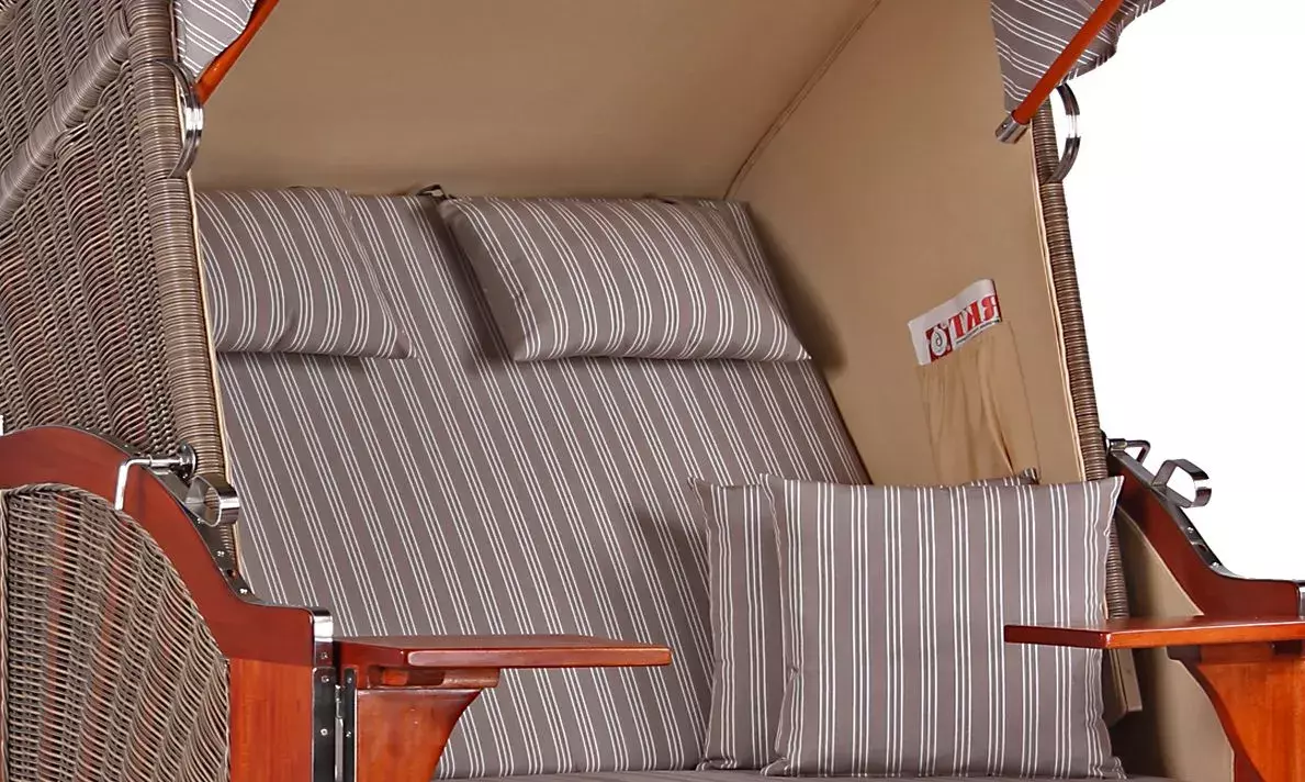 Es handelt sich bei diesem Modell um ein exklusives und sehr hochwertiges Produkt. Das verstellbare Vordach schützt Sie vor Wind und Sonne, so dass Sie beispielsweise gemütlich lesen können. Weiche Wechselpolster sowie Kissen und Nackenkissen lassen Sie in tiefe Träume versinken. Auf den kleinen ausziehbaren Seitentischen können Sie gerne Ihre Getränke und Snacks abstellen. Das Innere der Sitzbank bietet reichlich Stauraum für die Unterbringung diverser Utensilien. Selbstverständlich können Sie Ihre Sitz- und Liegeposition variabel gestalten, denn dieser Strandkorb lässt sich bis zu 175° verstellen. Auch das Design und die farbliche Gestaltung der Wechselpolster zeugen von höchster Qualität und lassen Urlaubswünsche zu Hause wahr werden.