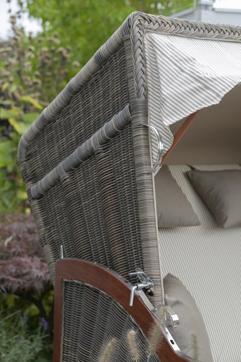 Die ersten Strandkörbe im 19. Jahrhundert wurden traditionell aus Natur-Rattan geflochten. Doch das eher brüchige und nicht besonders langlebige Material wurde längst durch sogenanntes PE(Polyethylen)-Rattan ersetzt. PE-Rattan eignet sich hervorragend für den Einsatz im Outdoorbereich, denn es ist nicht nur witterungs- und UV-Beständig, sondern hält auch großen Temperaturschwankungen stand. Außerdem lässt sich kinderleicht pflegen, denn die glatte Oberfläche ist schmutz- und witterungsabweisend. Das Material besteht aus Polyethylen, einem Kunststoff, der sich, neben den beschriebenen Eigenschaften, zudem vielfältig farblich gestalten lässt und so das Design unserer Strandkorb-Serie Spiekeroog perfekt unterstützt. Die liebevolle Beflechtung der Strandkörbe in Handarbeit und die interessante Gestaltung des Seitenteils mit seinem Sonnengeflecht machen den Strandkorb Spiekeroog zu einem Hingucker in Ihrem Outdoorbereich!