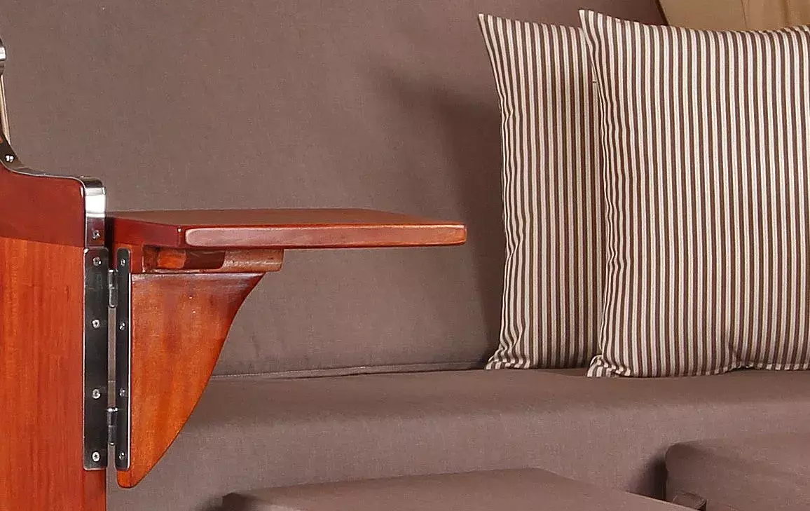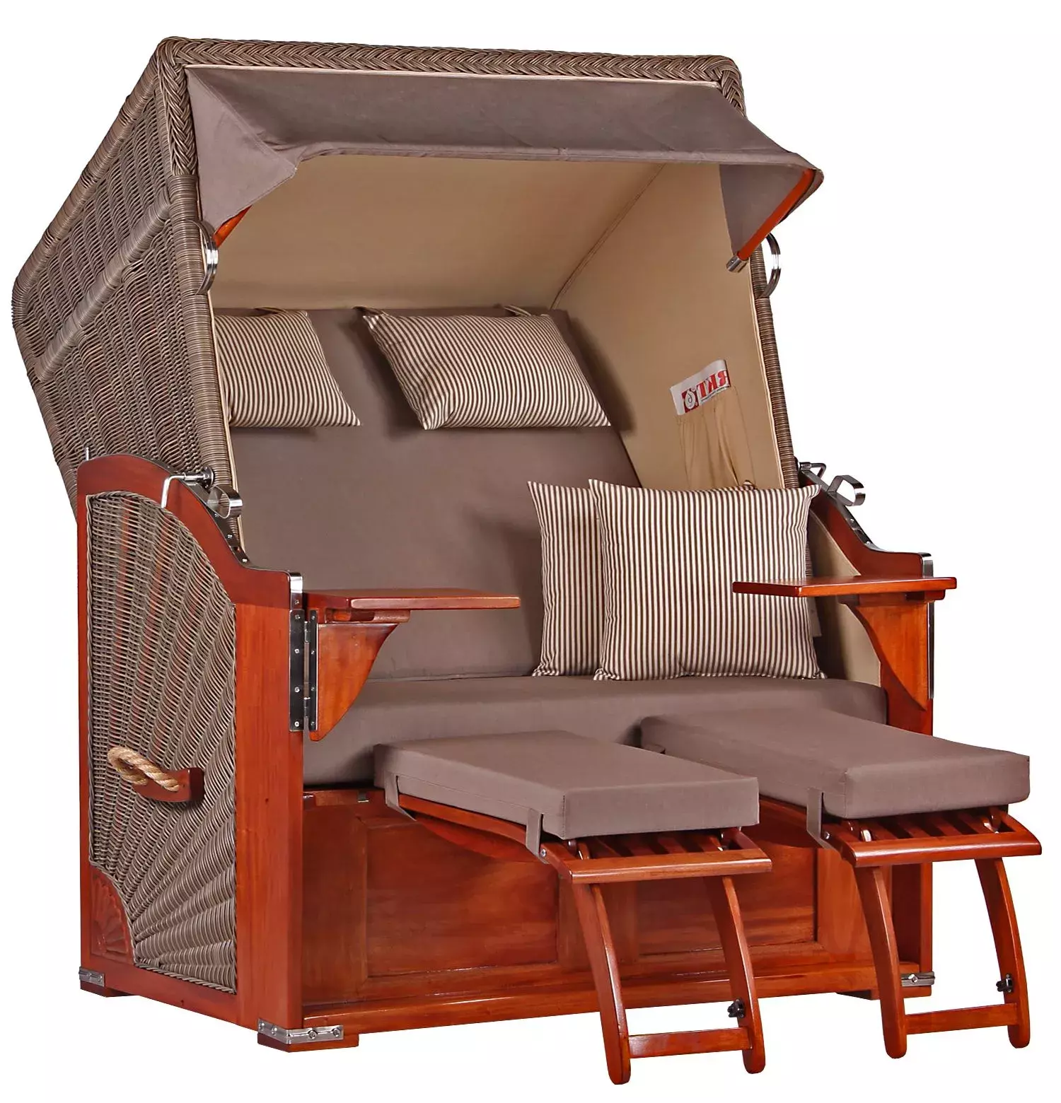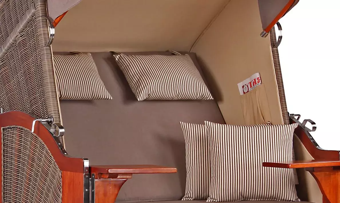 Für unseren Strandkorb Spiekeroog legen wir besonderen Wert auf die liebevolle Verarbeitung hochwertiger Materialien. Aus diesem Grund eignet sich edles Mahagoniholz mit seiner charakteristisch rötlich-braunen Färbung sehr gut für unsere Strandkörbe. Mahagoniholz, traditionell im Schiffsbau eingesetzt, überzeugt auch beim Einsatz im Outdoorbereich durch seine positiven Eigenschaften. Denn Mahagoniholz ist ein besonders hartes Holz, das sehr witterungsbeständig und zudem kaum anfällig für Pilze und Insekten ist. Kurzum, das perfekte Holz nicht nur für Gartenmöbel, sondern auch für unsere hochwertigen Strandkörbe. Das rot-braune Mahagoni-Holzes unterstützt zudem den maritimen Charakter des Strandkorbes Spiekeroog und verleihen diesem seine einzigartige Optik. Um lange Freude am Strandkorb Spiekeroog zu haben, empfehlen wir die regelmäßige Lackierung des Holzes mit einem offenporigen PU-Lack. So wird der Strandkorb Spiekeroog sicherlich auch bald zu Ihrem Lieblingsstück auf der Terrasse!