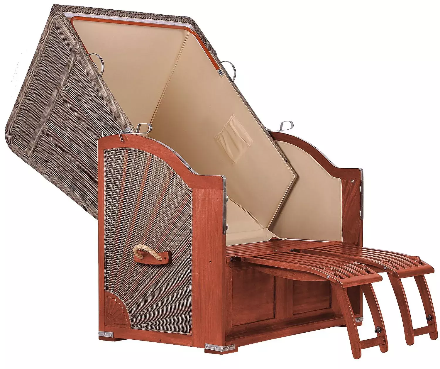 Am Nord- oder Ostseestrand gehören Strandkörbe zum Ambiente. Sie ermöglichen auch bei windigem Wetter einen angenehmen Strandaufenthalt, sind ein kleines Domizil für romantische Zweisamkeit am Strand. Die Geborgenheit, die sie vermitteln, holen Sie sich mit dem Strandkorb Spiekeroog Mahagoni in den heimischen Garten. Ob Sie die Liegefläche zum Volllieger ausklappen für ein windgeschütztes Sonnenbad oder sich an einem kühlen Abend zu zweit in eine Decke gekuschelt ein Glas Wein gönnen, Sie sitzen bequem und geschützt. Wo auch immer Sie Ihren Strandkorb aufstellen, in Ihrem Inneren werden Sie das Rauschen der Wellen hören und Ihre Seele macht Urlaub. Der Strandkorb Spiekeroog Mahagoni überzeugt nicht nur durch seine klassische Form und das edle und schöne Mahagoniholz, er verfügt auch über viele Details, die das Leben so richtig angenehm machen. Fürs bequeme Sitzen und Liegen sind neben den extra dicken Polstern zwei einhängbare Fußstützen, zwei Nacken- und zwei Wurfkissen zuständig. Für ein festliches Glas Sekt oder eine gemütliche Tasse Kaffee oder Tee hängen Sie die schwenkbaren Bistrotischchen am Strandkorb ein. Das großzügige Staufach unter dem Sitz bietet Raum für Fußstützen und Kissen, aber auch für andere Utensilien, die Sie beim Entspannen im Strandkorb gerne in der Nähe wissen. Die beiden Zeitungstaschen eignen sich nicht nur für Lesestoff, sondern auch für andere Kleinigkeiten, die Sie gerne griffbereit haben. Auch wenn Sie Ihren Strandkorb zum Liegen zurückgeklappt haben, bietet Ihnen die Markise Sonnenschutz nach Wunsch.