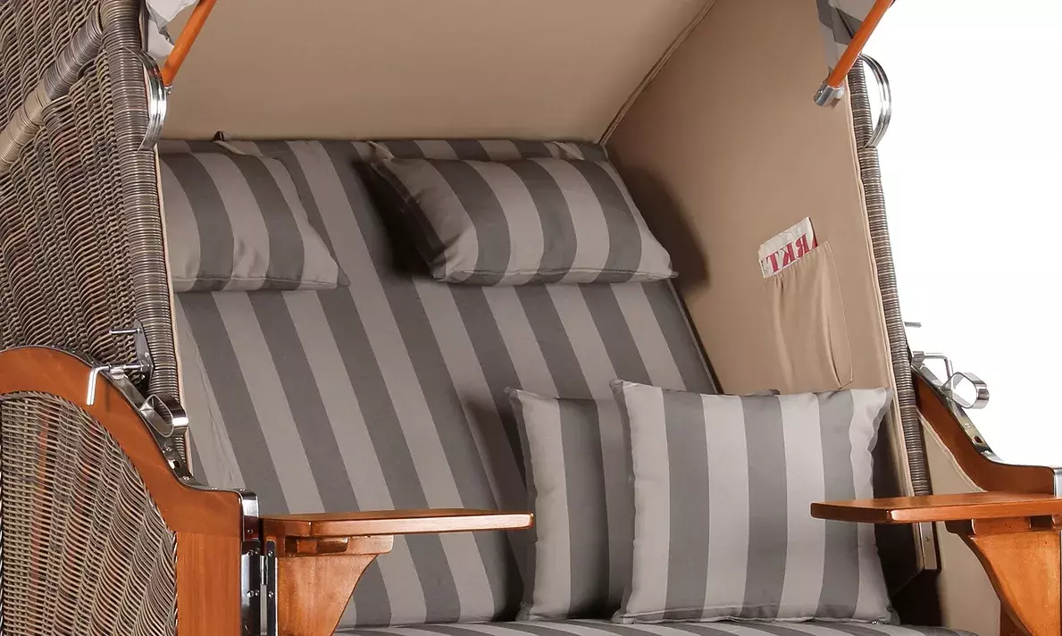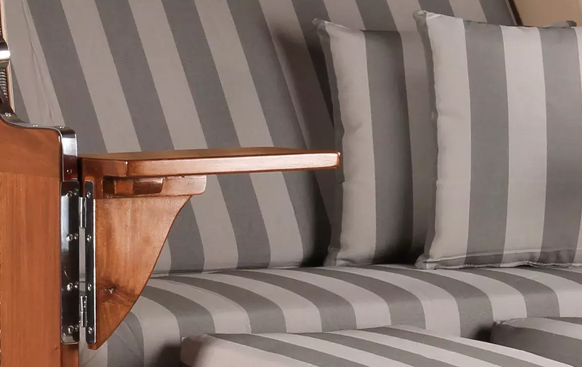Für unseren Strandkorb Spiekeroog legen wir besonderen Wert auf die liebevolle Verarbeitung hochwertiger Materialien. Aus diesem Grund eignet sich edles Mahagoniholz mit seiner charakteristisch rötlich-braunen Färbung sehr gut für unsere Strandkörbe. Mahagoniholz, traditionell im Schiffsbau eingesetzt, überzeugt auch beim Einsatz im Outdoorbereich durch seine positiven Eigenschaften. Denn Mahagoniholz ist ein besonders hartes Holz, das sehr witterungsbeständig und zudem kaum anfällig für Pilze und Insekten ist. Kurzum, das perfekte Holz nicht nur für Gartenmöbel, sondern auch für unsere hochwertigen Strandkörbe. Das rot-braune Mahagoni-Holzes unterstützt zudem den maritimen Charakter des Strandkorbes Spiekeroog und verleihen diesem seine einzigartige Optik. Um lange Freude am Strandkorb Spiekeroog zu haben, empfehlen wir die regelmäßige Lackierung des Holzes mit einem offenporigen PU-Lack. So wird der Strandkorb Spiekeroog sicherlich auch bald zu Ihrem Lieblingsstück auf der Terrasse!