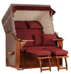 Für unseren Strandkorb Spiekeroog legen wir besonderen Wert auf die liebevolle Verarbeitung hochwertiger Materialien. Aus diesem Grund eignet sich edles Mahagoniholz mit seiner charakteristisch rötlich-braunen Färbung sehr gut für unsere Strandkörbe. Mahagoniholz, traditionell im Schiffsbau eingesetzt, überzeugt auch beim Einsatz im Outdoorbereich durch seine positiven Eigenschaften. Denn Mahagoniholz ist ein besonders hartes Holz, das sehr witterungsbeständig und zudem kaum anfällig für Pilze und Insekten ist. Kurzum, das perfekte Holz nicht nur für Gartenmöbel, sondern auch für unsere hochwertigen Strandkörbe. Das rot-braune Mahagoni-Holzes unterstützt zudem den maritimen Charakter des Strandkorbes Spiekeroog und verleihen diesem seine einzigartige Optik. Um lange Freude am Strandkorb Spiekeroog zu haben, empfehlen wir die regelmäßige Lackierung des Holzes mit einem offenporigen PU-Lack. So wird der Strandkorb Spiekeroog sicherlich auch bald zu Ihrem Lieblingsstück auf der Terrasse!