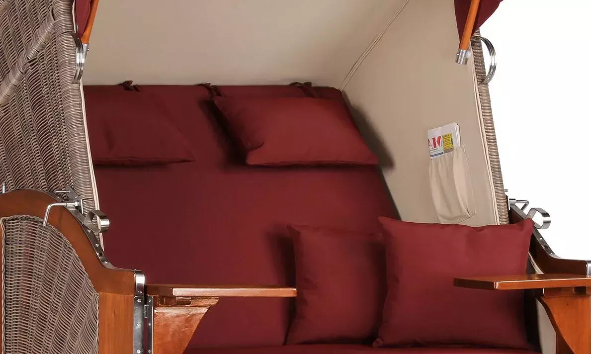 Am Nord- oder Ostseestrand gehören Strandkörbe zum Ambiente. Sie ermöglichen auch bei windigem Wetter einen angenehmen Strandaufenthalt, sind ein kleines Domizil für romantische Zweisamkeit am Strand. Die Geborgenheit, die sie vermitteln, holen Sie sich mit dem Strandkorb Spiekeroog Mahagoni in den heimischen Garten. Ob Sie die Liegefläche zum Volllieger ausklappen für ein windgeschütztes Sonnenbad oder sich an einem kühlen Abend zu zweit in eine Decke gekuschelt ein Glas Wein gönnen, Sie sitzen bequem und geschützt. Wo auch immer Sie Ihren Strandkorb aufstellen, in Ihrem Inneren werden Sie das Rauschen der Wellen hören und Ihre Seele macht Urlaub. Der Strandkorb Spiekeroog Mahagoni überzeugt nicht nur durch seine klassische Form und das edle und schöne Mahagoniholz, er verfügt auch über viele Details, die das Leben so richtig angenehm machen. Fürs bequeme Sitzen und Liegen sind neben den extra dicken Polstern zwei einhängbare Fußstützen, zwei Nacken- und zwei Wurfkissen zuständig. Für ein festliches Glas Sekt oder eine gemütliche Tasse Kaffee oder Tee hängen Sie die schwenkbaren Bistrotischchen am Strandkorb ein. Das großzügige Staufach unter dem Sitz bietet Raum für Fußstützen und Kissen, aber auch für andere Utensilien, die Sie beim Entspannen im Strandkorb gerne in der Nähe wissen. Die beiden Zeitungstaschen eignen sich nicht nur für Lesestoff, sondern auch für andere Kleinigkeiten, die Sie gerne griffbereit haben. Auch wenn Sie Ihren Strandkorb zum Liegen zurückgeklappt haben, bietet Ihnen die Markise Sonnenschutz nach Wunsch.