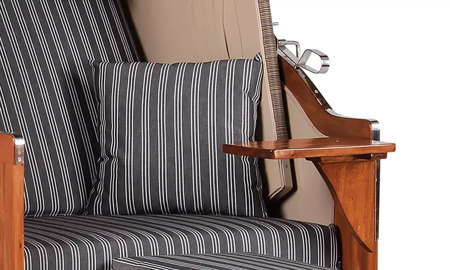 Um das stilvolle Design der Strandkorb-Serie Spiekeroog Single zu komplettieren, verwenden wir für die Beschläge der Strandkörbe ausschließlich hochwertigen V2A-Edelstahl. Die positiven Eigenschaften des Edelstahls, wie z.B. seine Korrosionsbeständigkeit, unterstreichen den edlen Charakter und heben den maritimen Look des Strandkorbes Nordstrand Single hervor. So bestehen nicht nur die Winkelverstärkungen im unteren Bereich des Strandkorbes, sondern auch der Feststellmechanismus aus V2A-Edelstahl. Um den Strandkorb rundum perfekt zu machen, haben wir diesen zudem mit vielen Extras, wie einer bequemen Polsterung, farblich passenden Wurf- und Nackenkissen, Zeitungstaschen, schwenkbaren Bistrotischen und einem praktischen Staufach unterhalb der Sitzfläche ausgestattet. Somit lässt der Strandkorb Spiekeroog Single keine Wünsche offen und bereichert jede Terrasse.