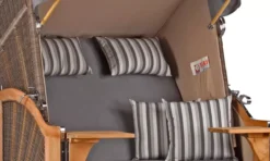 So stellt sich echtes Urlaubsfeeling auch zuhause im Garten ein: Ordern Sie einen Strandkorb aus echtem Teakholz. Unser Teak aus zertifiziertem, südostasiatischen Plantagenanbau brauchen Sie nicht zu pflegen. Die silbergraue Schutzschicht bildet sich unter Witterungseinfluss von selbst. Strandkörbe sind zeitlose Gartenmöbel an denen Sie lange Zeit Freude haben werden. Die Wechselpolster in unserem Volllieger sind mit strapazierfähigem, waschbarem Markisenstoff bezogen. Das Korbmaterial wird aus witterungs- und UV-beständigem PE-Geflecht hergestellt, die Beschläge aus Edelstahl. So stellen wir sicher, dass Ihr exklusives Prunkstück im Garten Sie viele Jahre begleiten wird. Lassen Sie sich von Ihrem Strandkorb verführen und träumen Sie im eigenen Garten vom Urlaub an der Nord- oder Ostsee!