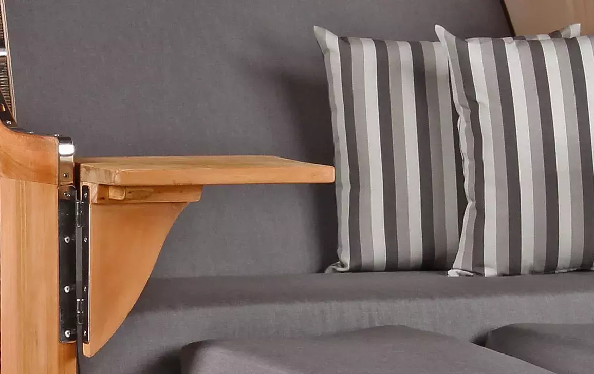 Um das stilvolle Design der Strandkorb-Serie Spiekeroog zu komplettieren, verwenden wir für die Beschläge der Strandkörbe ausschließlich hochwertigen V2A-Edelstahl. Die positiven Eigenschaften des Edelstahls, wie z.B. seine Korrosionsbeständigkeit, unterstreichen den edlen Charakter und heben den maritimen Look des Strandkorbes Spiekeroog hervor. So bestehen nicht nur die Winkelverstärkungen im unteren Bereich des Strandkorbes, sondern auch der Feststellmechanismus aus V2A-Edelstahl. Um den Strandkorb rundum perfekt zu machen, haben wir diesen zudem mit vielen Extras, wie einer bequemen Polsterung, farblich passenden Wurf- und Nackenkissen, Zeitungstaschen, schwenkbaren Bistrotischen und einem praktischen Staufach unterhalb der Sitzfläche ausgestattet. Somit lässt der Strandkorb Spiekeroog keine Wünsche offen und bereichert jede Terrasse.
