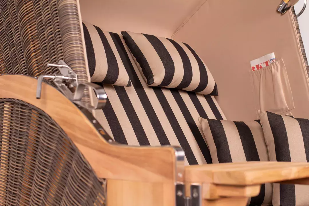 Um das stilvolle Design der Strandkorb-Serie Spiekeroog zu komplettieren, verwenden wir für die Beschläge der Strandkörbe ausschließlich hochwertigen V2A-Edelstahl. Die positiven Eigenschaften des Edelstahls, wie z.B. seine Korrosionsbeständigkeit, unterstreichen den edlen Charakter und heben den maritimen Look des Strandkorbes Spiekeroog hervor. So bestehen nicht nur die Winkelverstärkungen im unteren Bereich des Strandkorbes, sondern auch der Feststellmechanismus aus V2A-Edelstahl. Um den Strandkorb rundum perfekt zu machen, haben wir diesen zudem mit vielen Extras, wie einer bequemen Polsterung, farblich passenden Wurf- und Nackenkissen, Zeitungstaschen, schwenkbaren Bistrotischen und einem praktischen Staufach unterhalb der Sitzfläche ausgestattet. Somit lässt der Strandkorb Spiekeroog keine Wünsche offen und bereichert jede Terrasse.